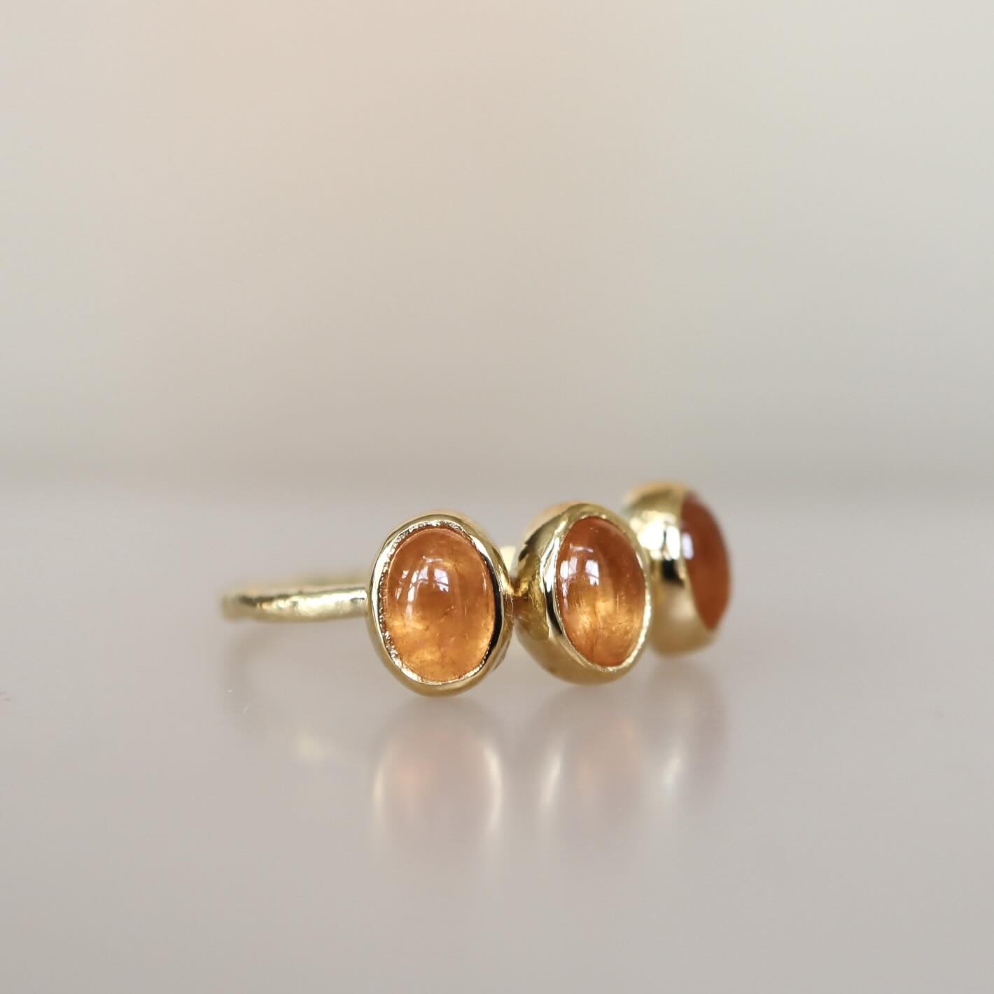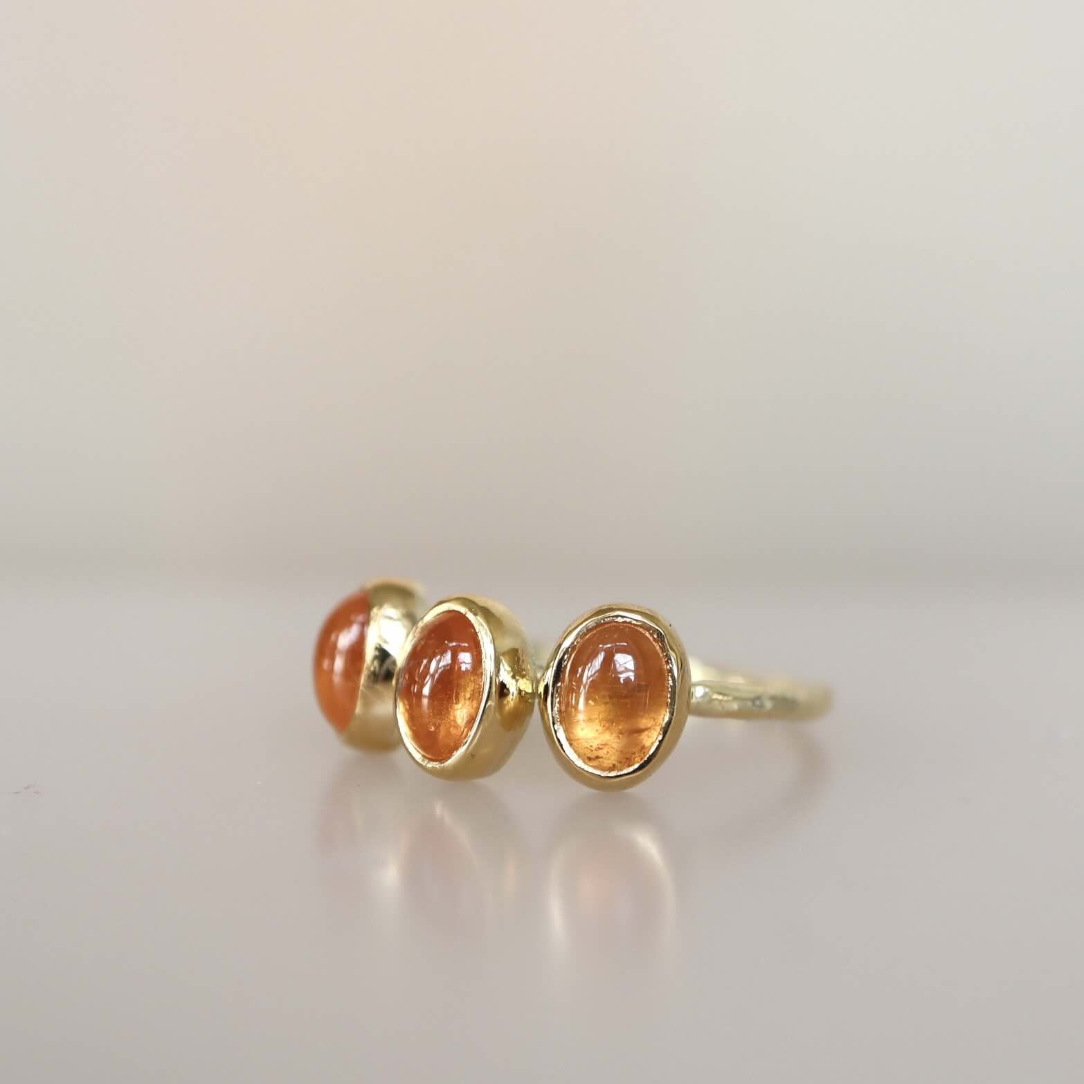 Zo’n mooie tint! Drie mandarijn granaten naast elkaar, net iets verspringend, op een grillig gevormde ring. De ring is gemaakt van 14 karaat goud, de zettingen zijn gemaakt van 22 karaat goud.
