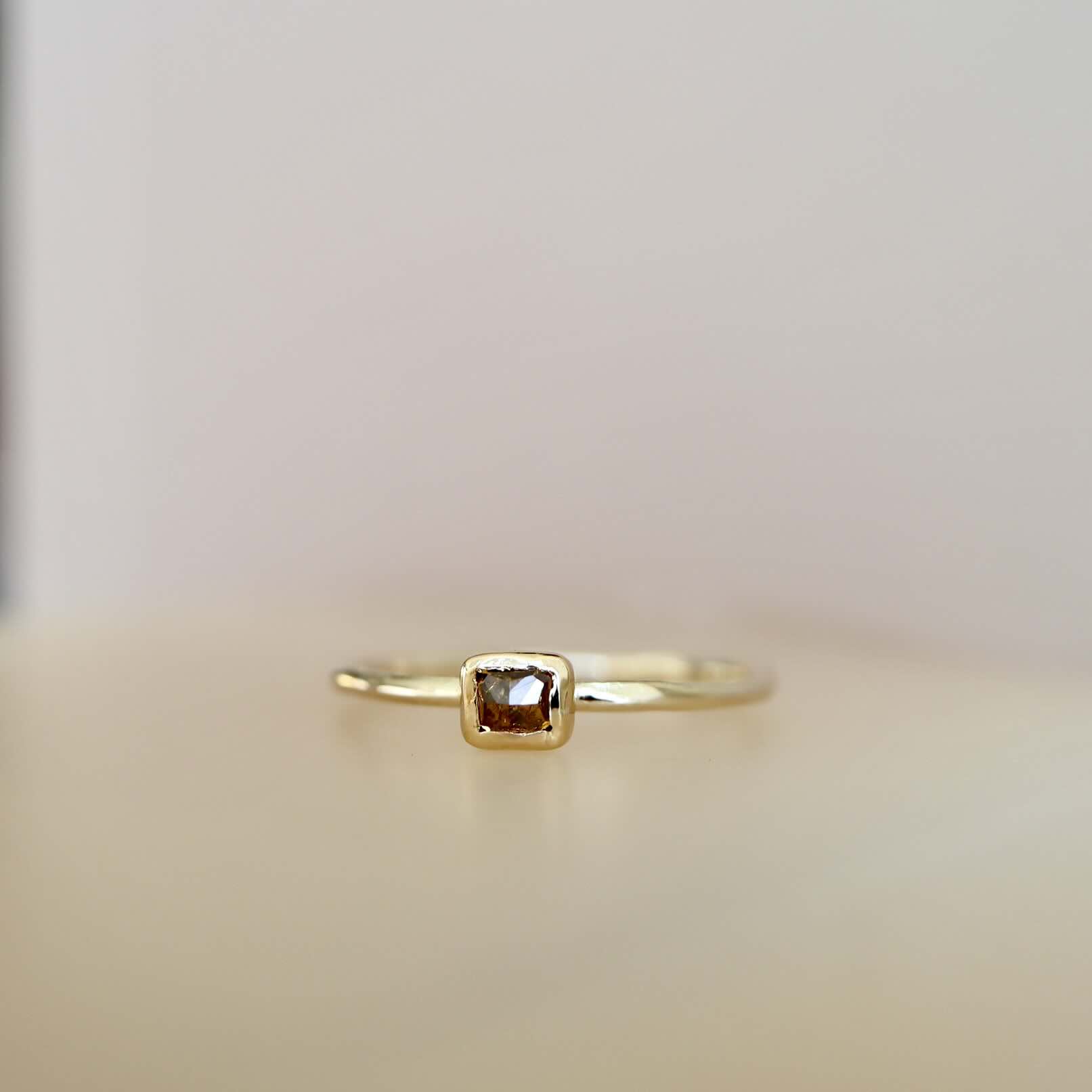 Een schitterende, caramel bruine diamant van 0.275 ct. Gezet in 22 karaat goud met een lichtjes gesmolten ring van 14 karaat goud.