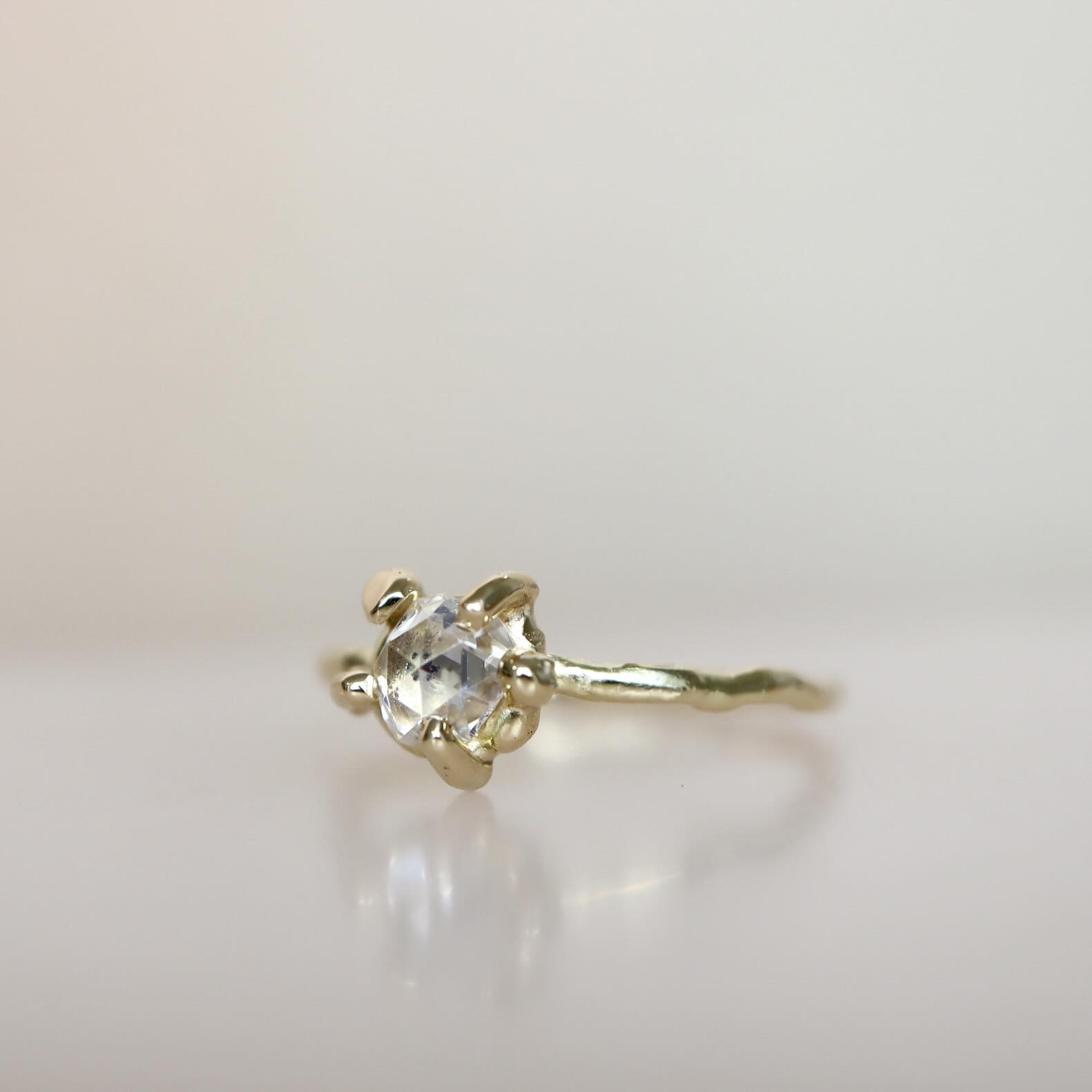 Een antique diamond van 0.425 ct., onbeschrijflijk mooi in deze ruwe pootjes-zetting van 22 karaat goud. De ring is grillig gevormd en gemaakt van 18 karaat goud.