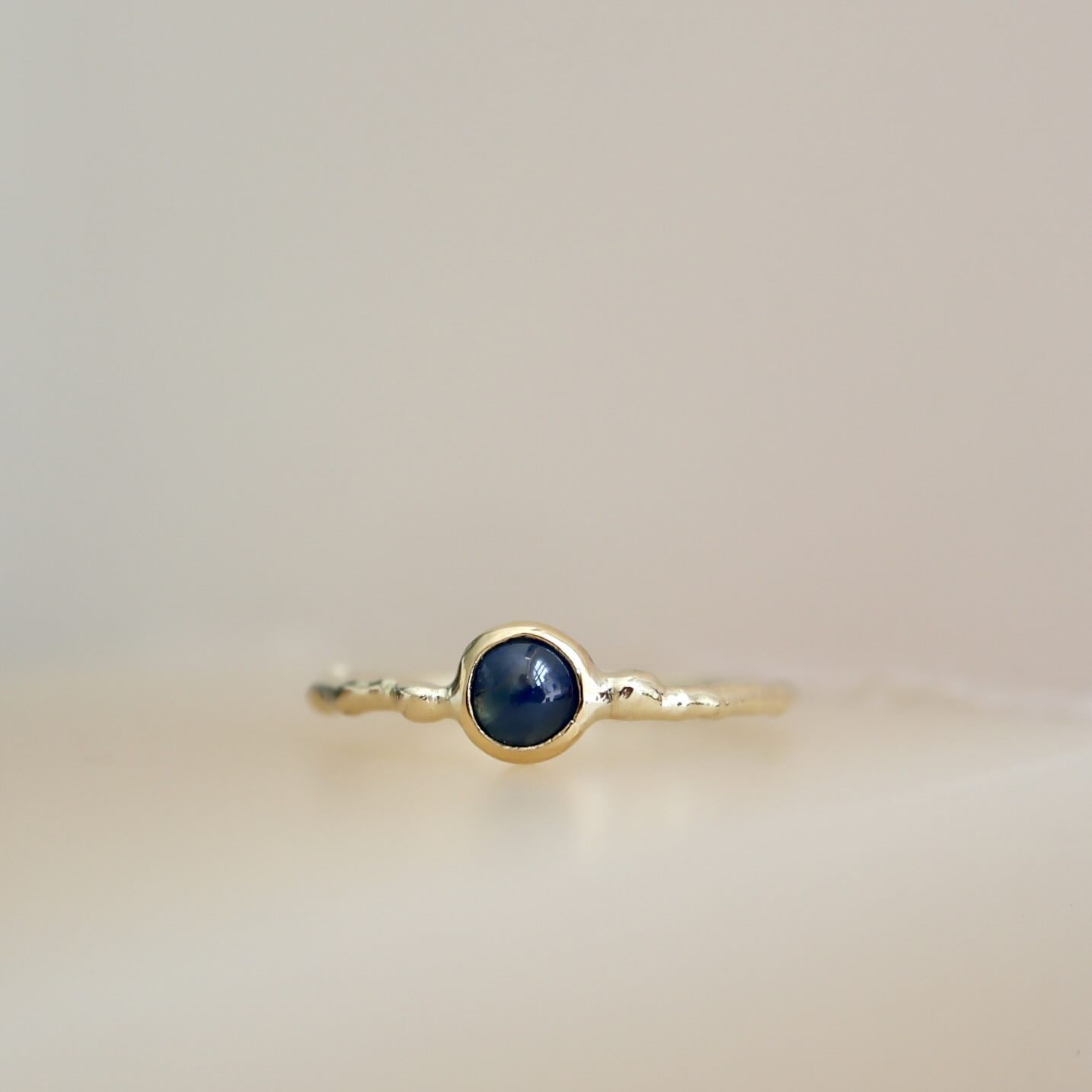 Een bijzonder mooie saffier tussen een ring van weelderig gesmolten, druppels goud. Gemaakt met 22 en 18 karaat goud.