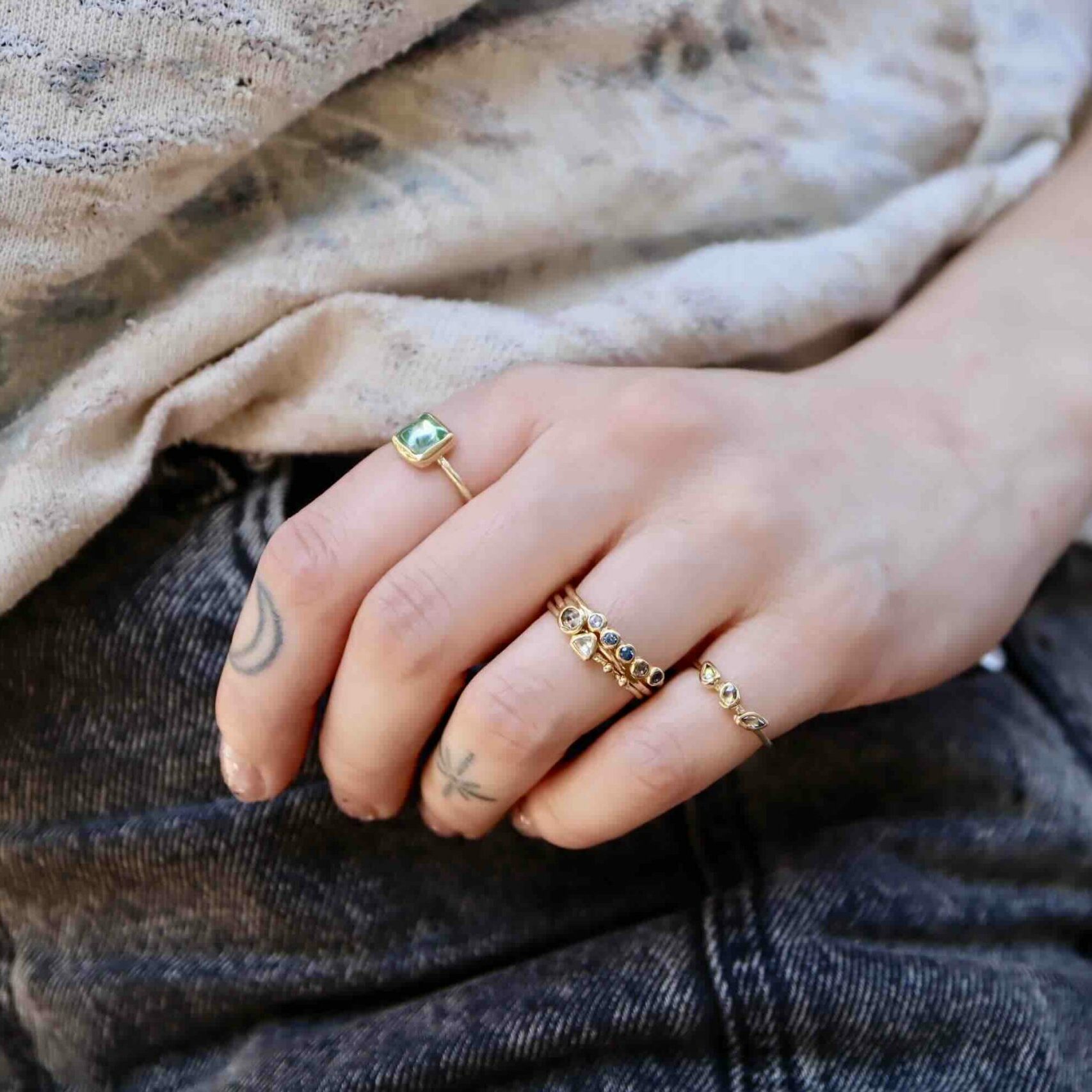 Te lief! Vijf kleine saffieren in verschillende tinten blauw en ‘rommelig’ gezet in 22 karaat goud. De tinten; blauw, lila, blauw, blauw en heel licht roze. Samen zijn ze 0.195 ct. De ring is gemaakt met 18 karaat goud.