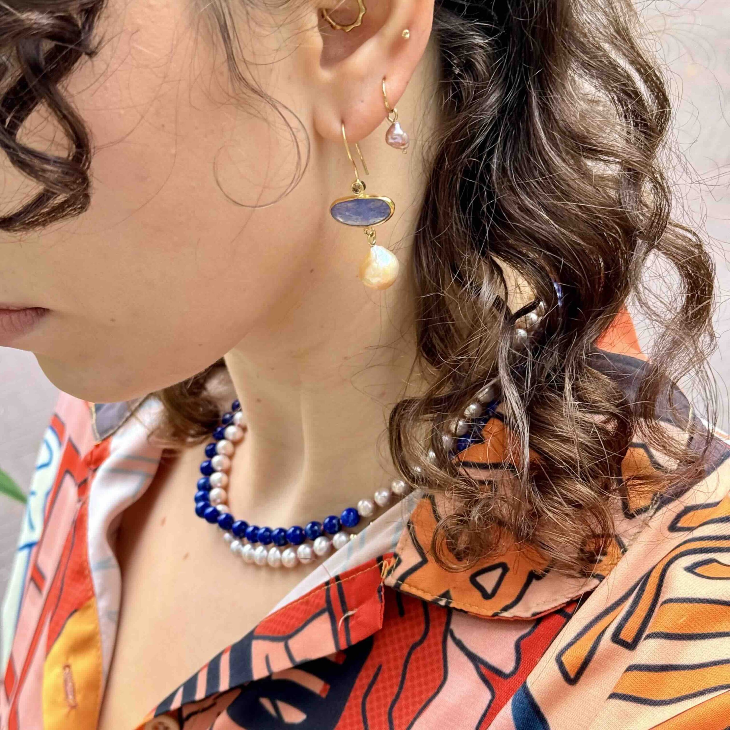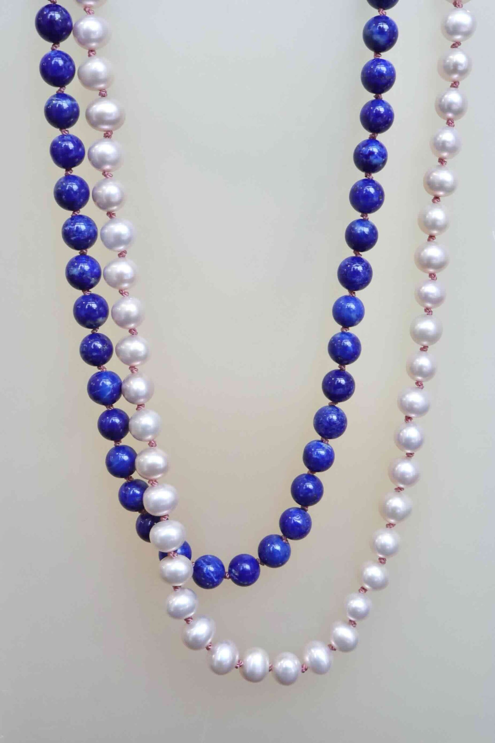 Lapis lazuli en roze zoetwaterparels! Héél contrastrijk qua sfeer, kleur en glans en precies spot-on mooi. Op roze draad geknoopt met een 14 karaat gouden magneet sluiting.