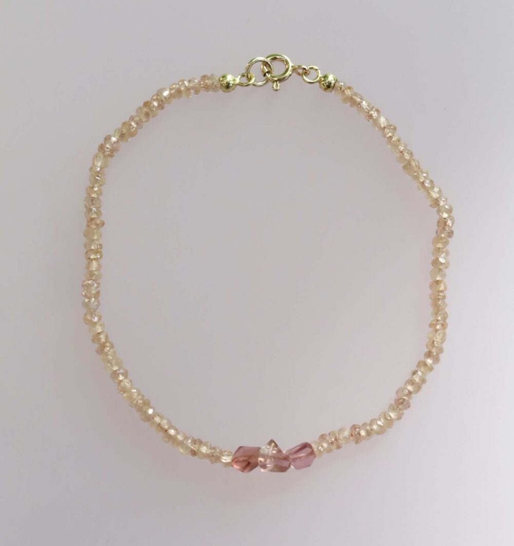 Een sprankelende, superzachte tint spinel met drie facet geslepen brokjes saffier in fris roze. Het slotje is gemaakt van 18 karaat geelgoud.