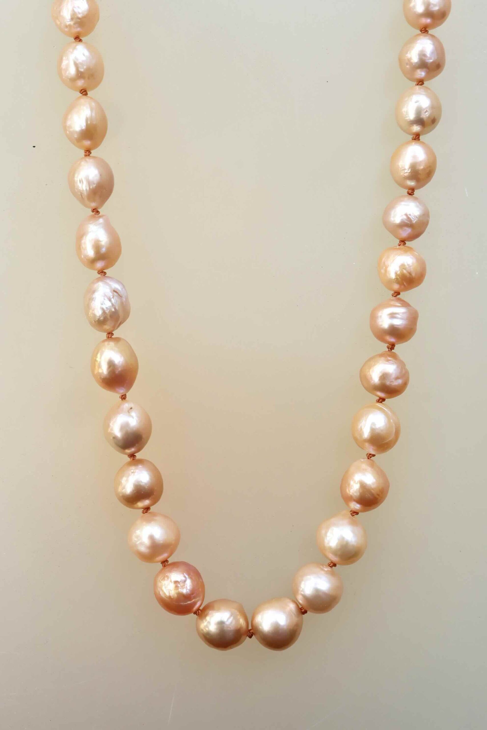 Wonderlijk mooie zoetwaterparels in peach tint! In baroque vormen met een uitbundige glans. Het magneet bolslot is gemaakt van 14 karaat goud.