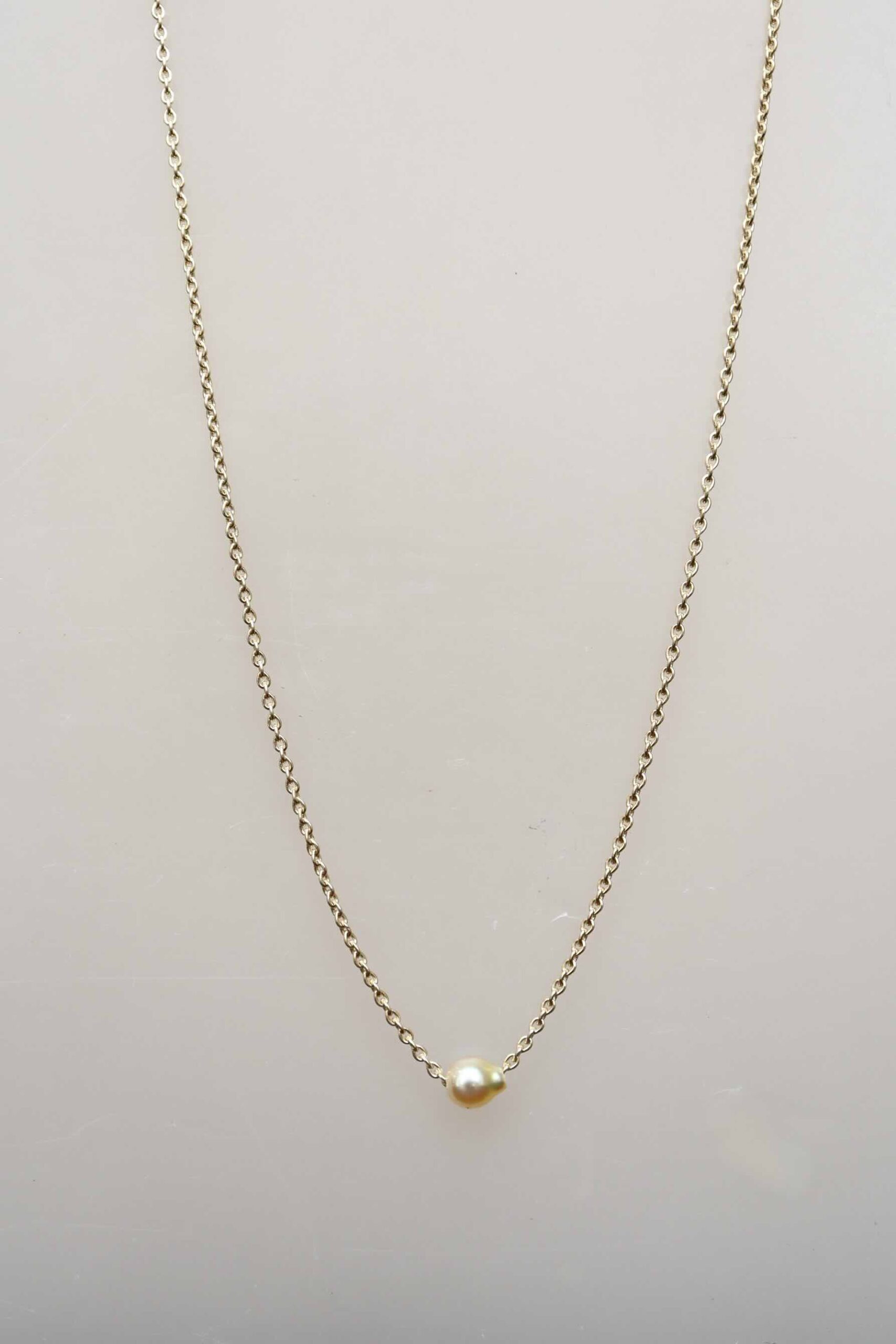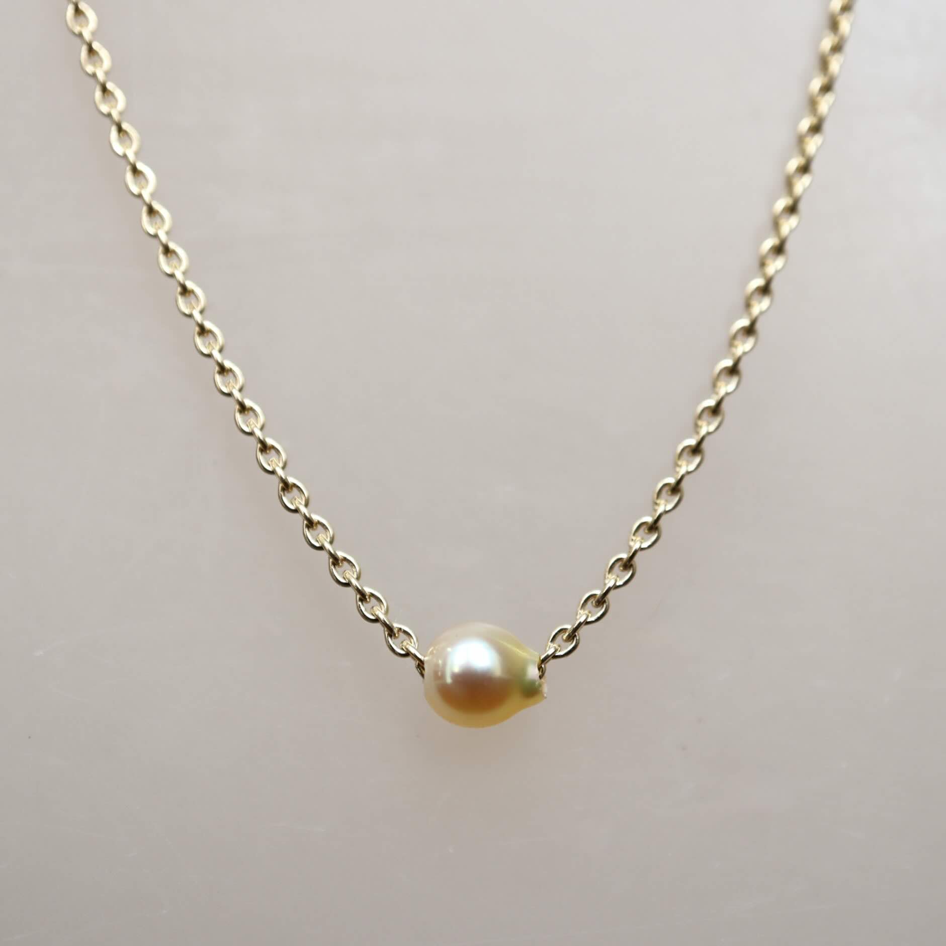 Een intens glanzend akoya pareltje met een zachtgele tint. Het pareltje schuift over het 18 karaat gouden anker collier.