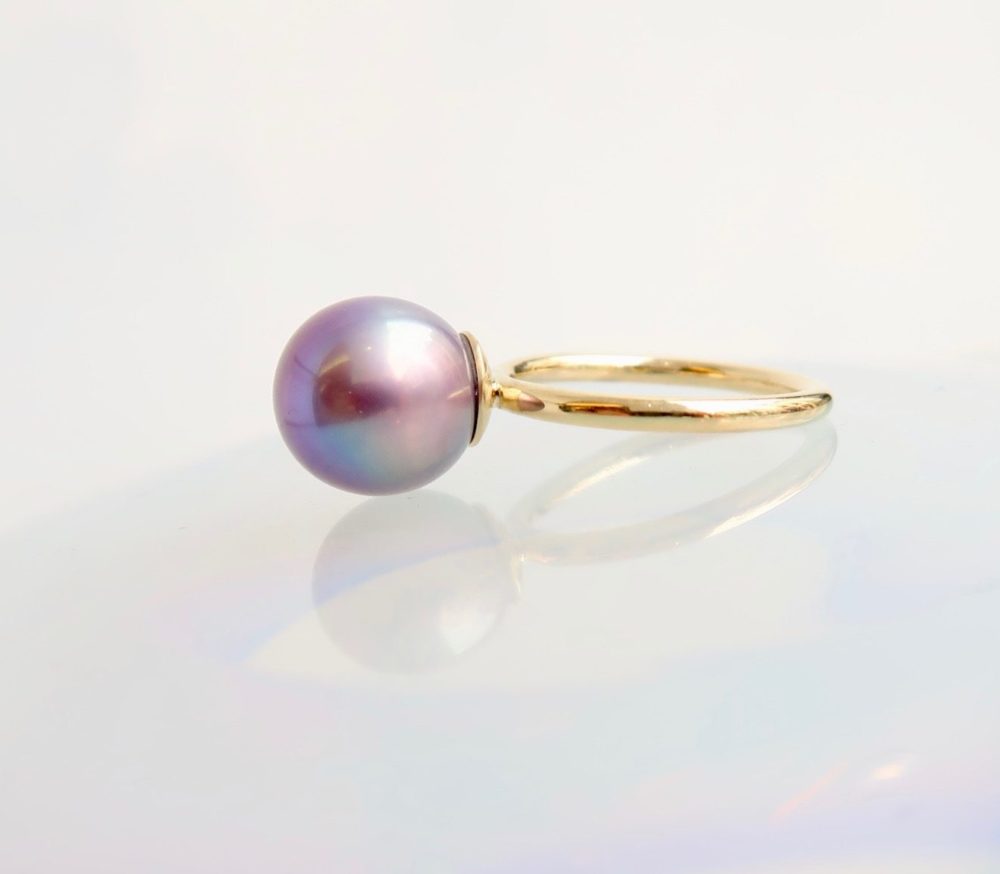 Een zoetwaterparel in een dromerige, lila tint. Een wonderlijk mooie ring van 18 karaat goud, prachtig van eenvoud.