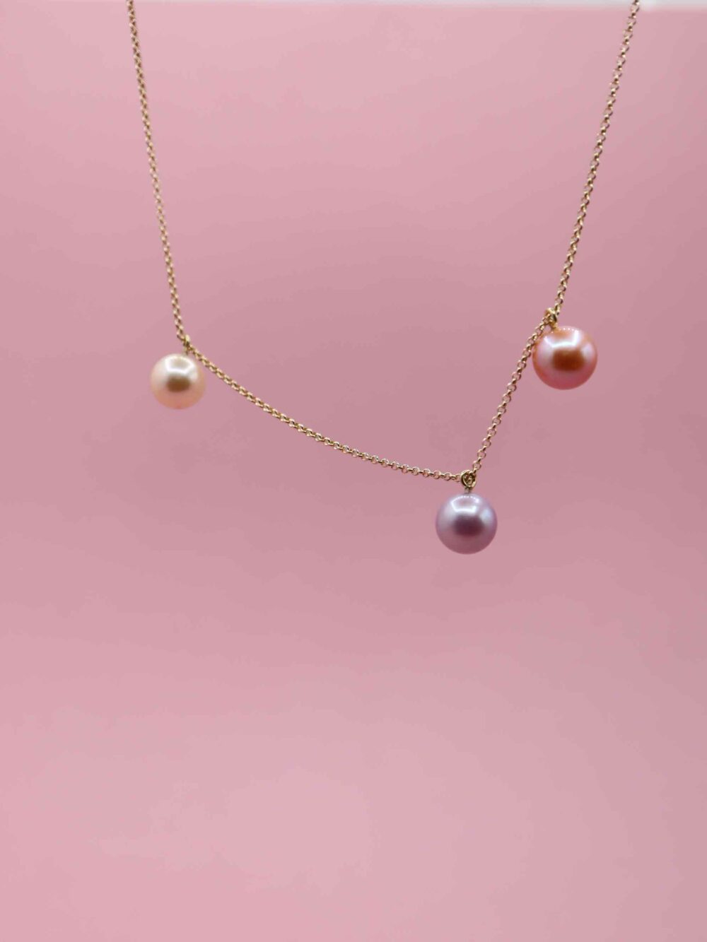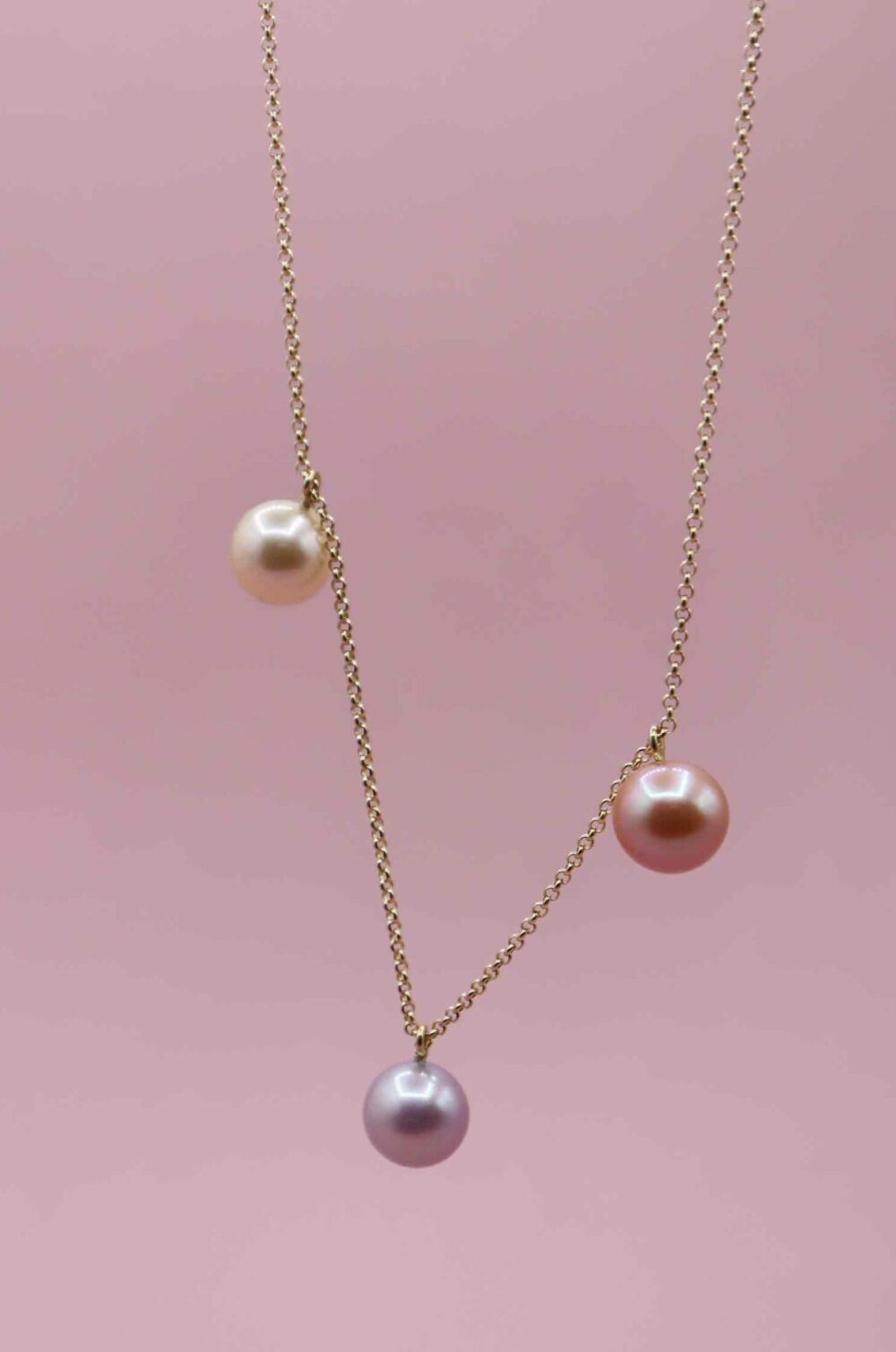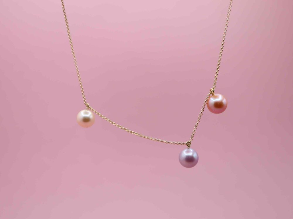 Een collier van 18 karaat gouden jasseron schakels met “zwevende” edison parels en één zoetwaterparel. Prachtig uitgelichte parels in een collier dat blij verrast.