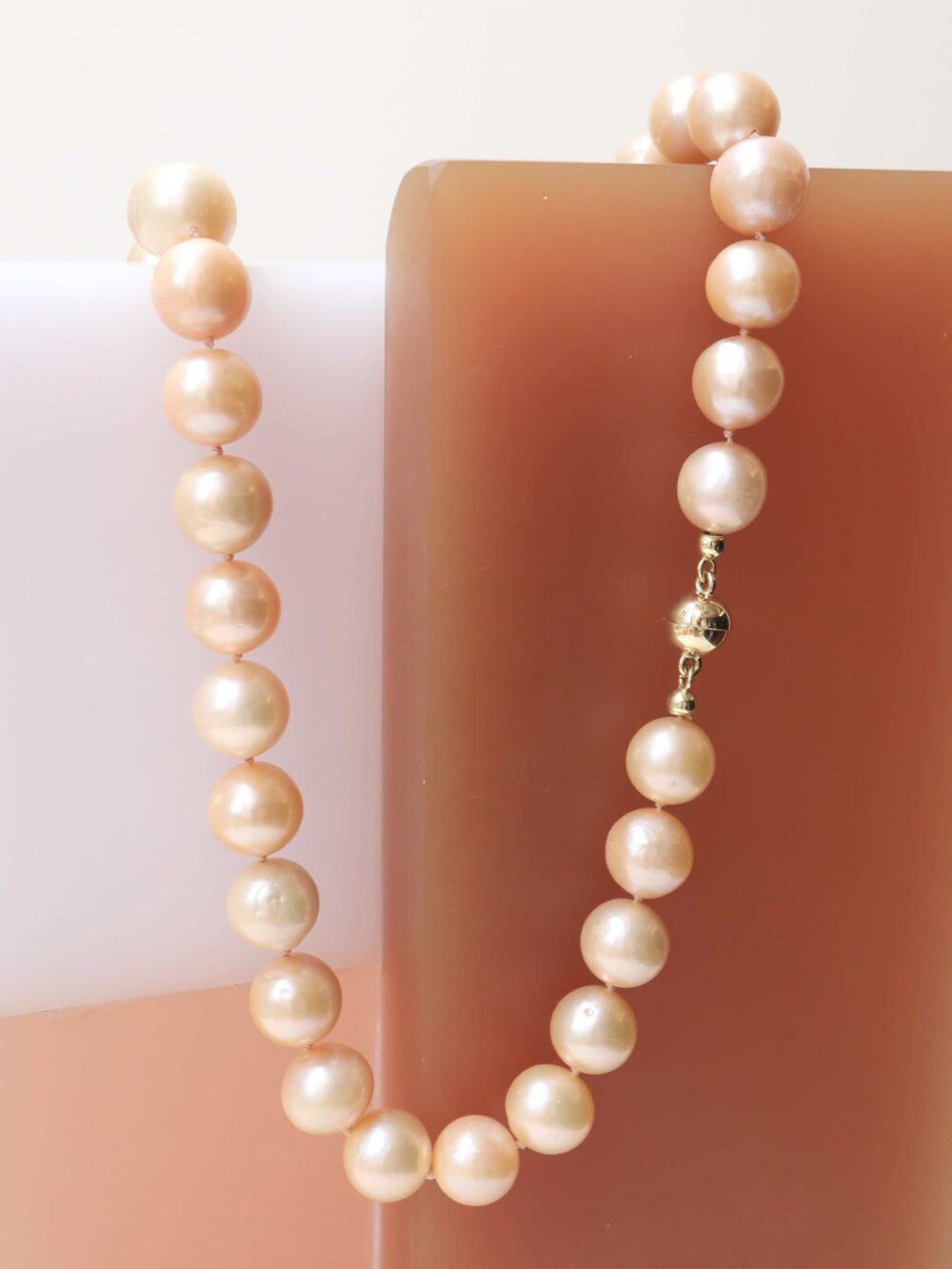 Edison parels in een zachte peach kleur. De parels zijn heel lichtjes oplopend van grootte. Het magneet bolslot is gemaakt van 18 karaat geelgoud.