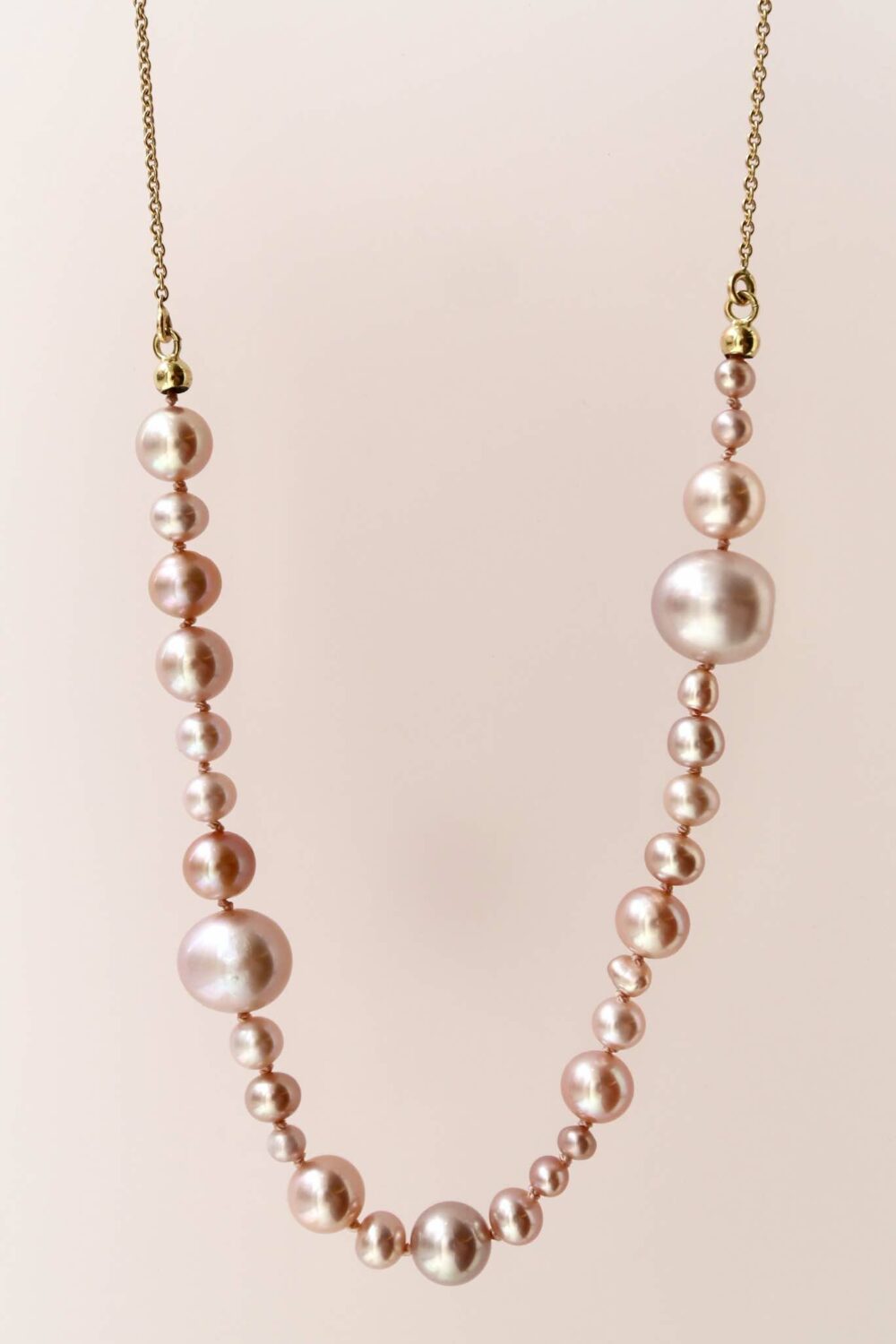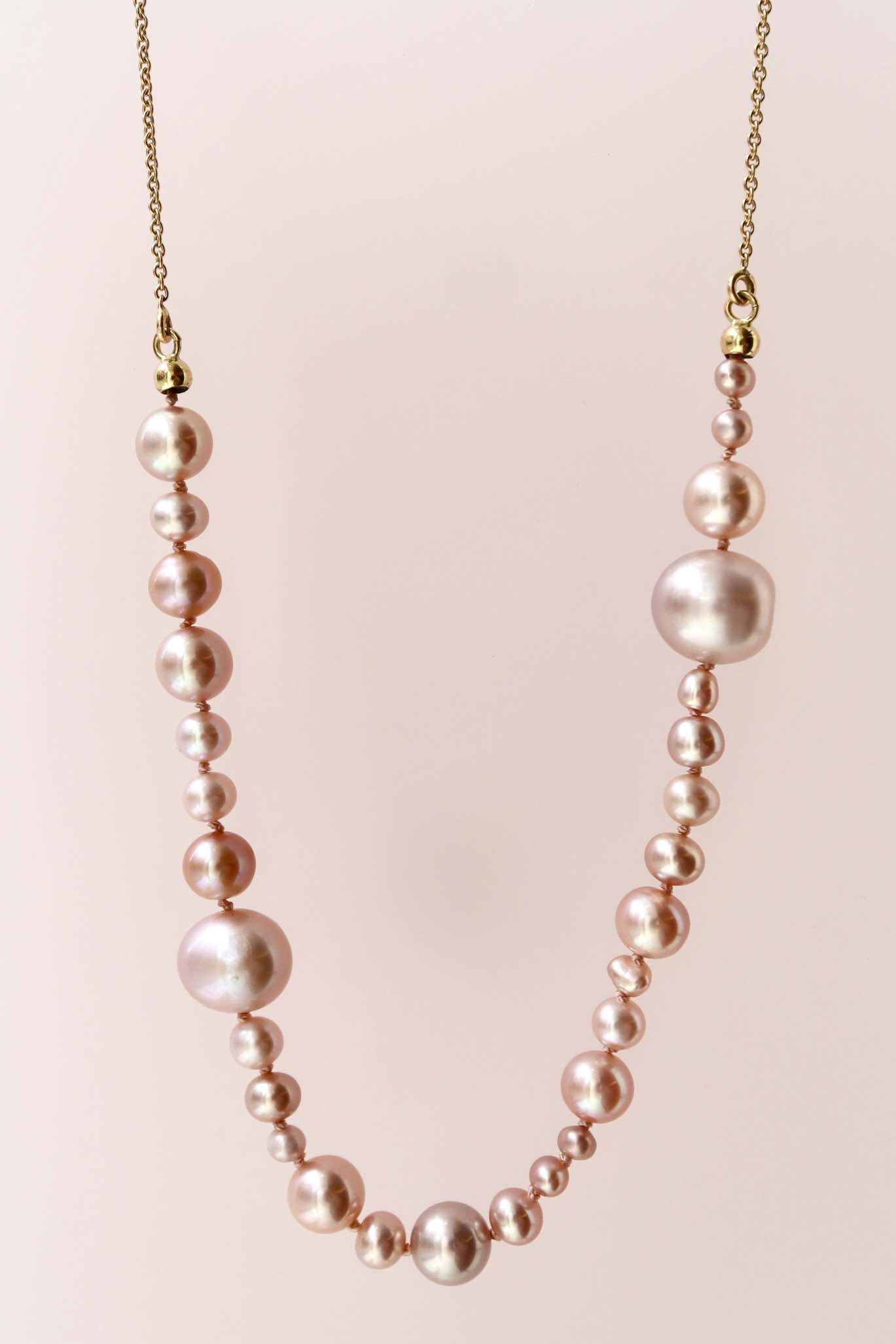 Roze zoetwaterparels in verschillende maten en anker schakels van 18 karaat goud. Een droom van een parel collier.