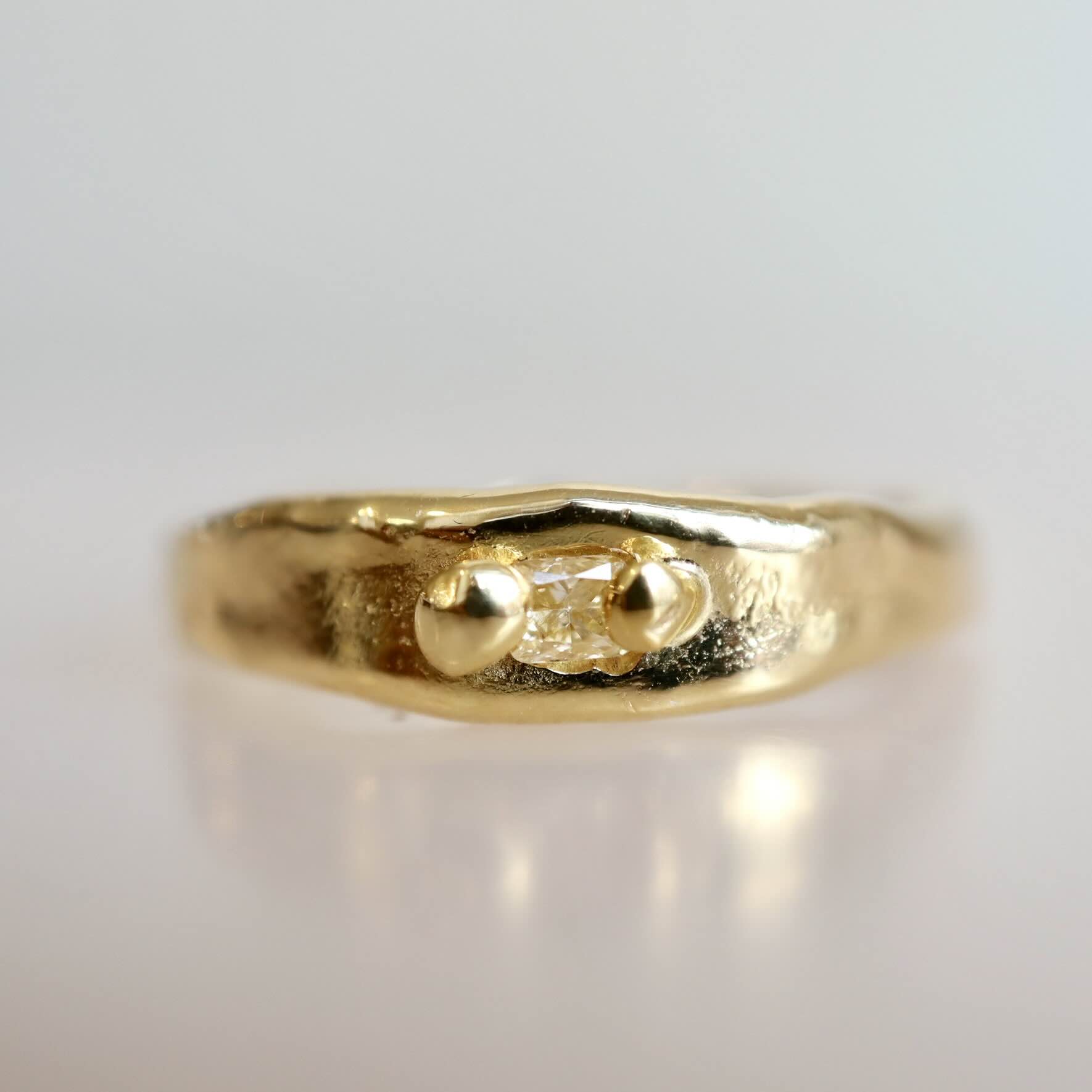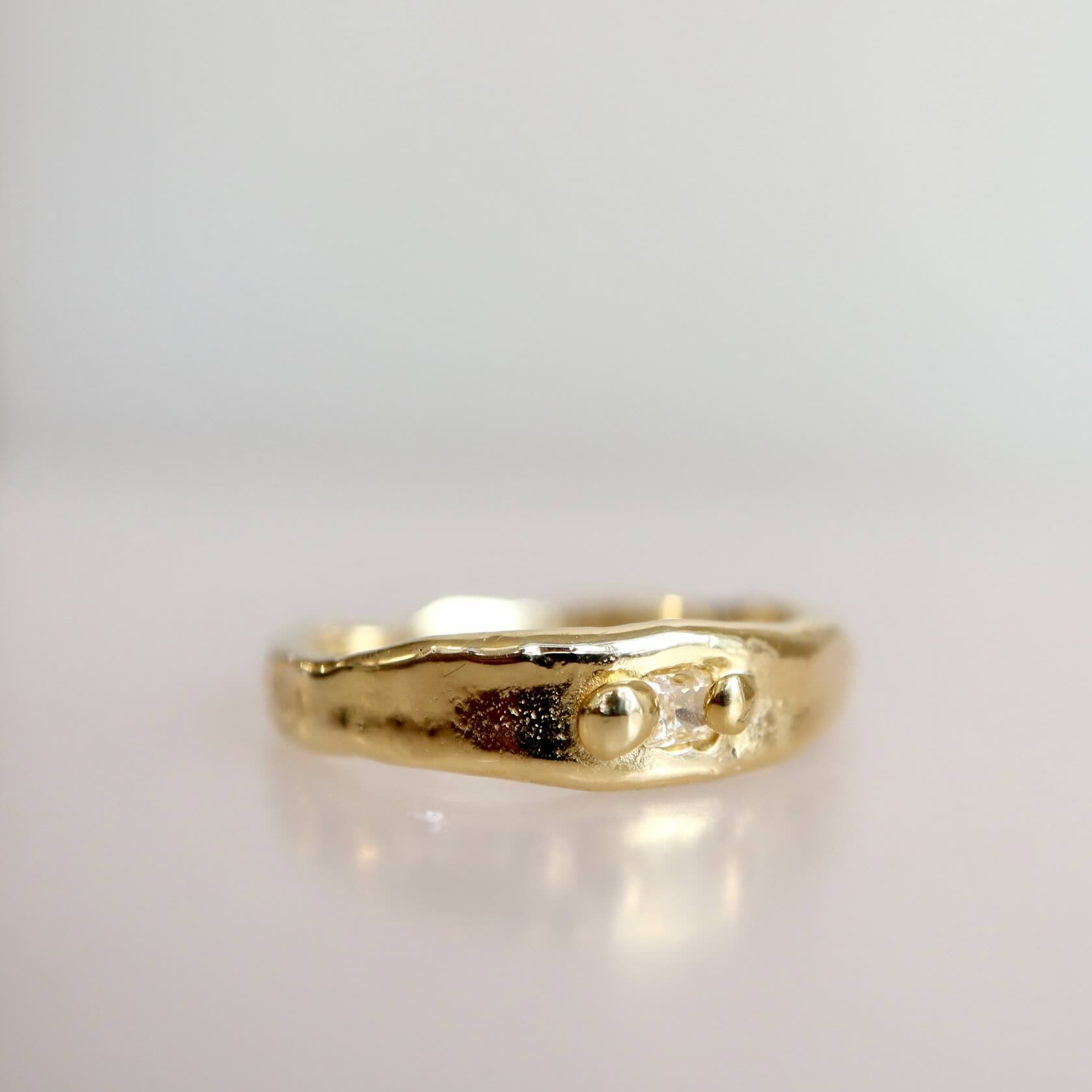 Een gesmolten ring met een prachtige clear shape diamant van 0.115 ct. gezet tussen bolletjes van goud. De ring is gemaakt van 18 karaat goud. Aan de bovenkant is de ring breed en loopt smal toe naar de onderkant.