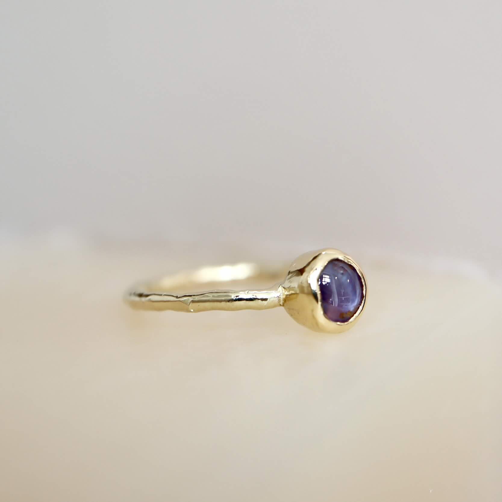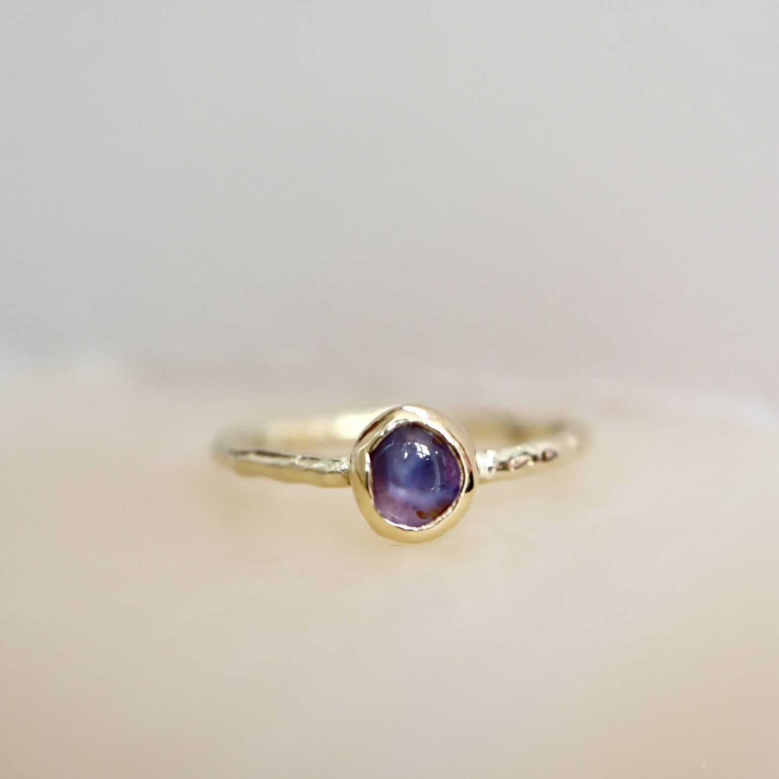Een paarse stersaffier die van binnenuit prachtig oplicht. De stersaffier is gezet in geboetseerd 22 karaat goud. De ring is weelderig en gemaakt van 18 karaat goud.