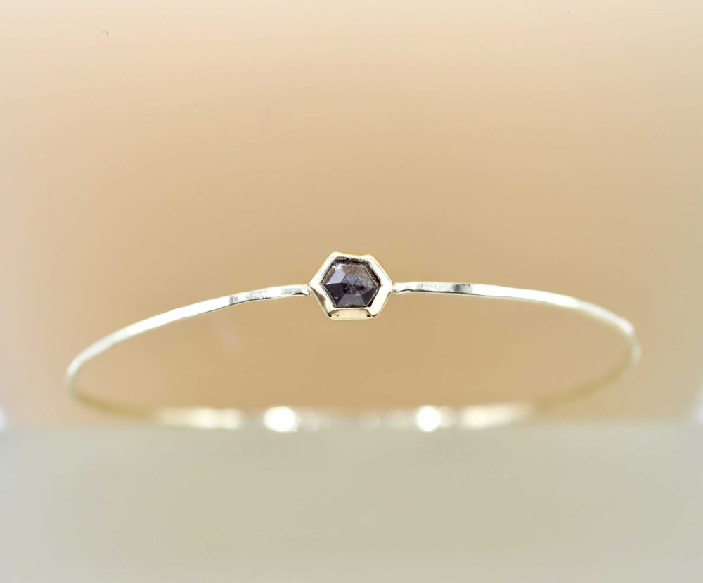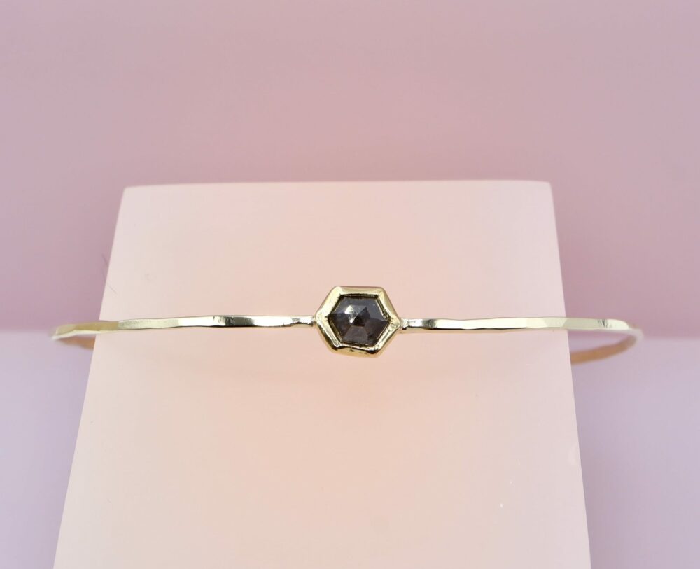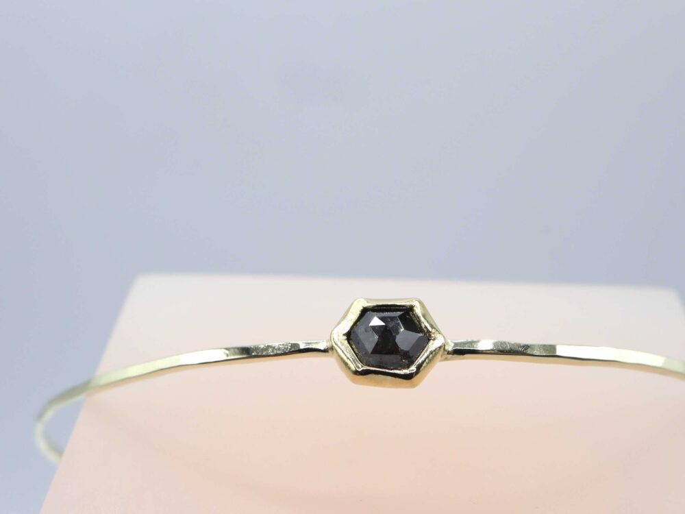 Een elegante gouden armband met een donkere hexagon diamant. De armband is gemaakt van 14 karaat geelgoud. De diamand heeft een gewicht van 0.5 ct.
