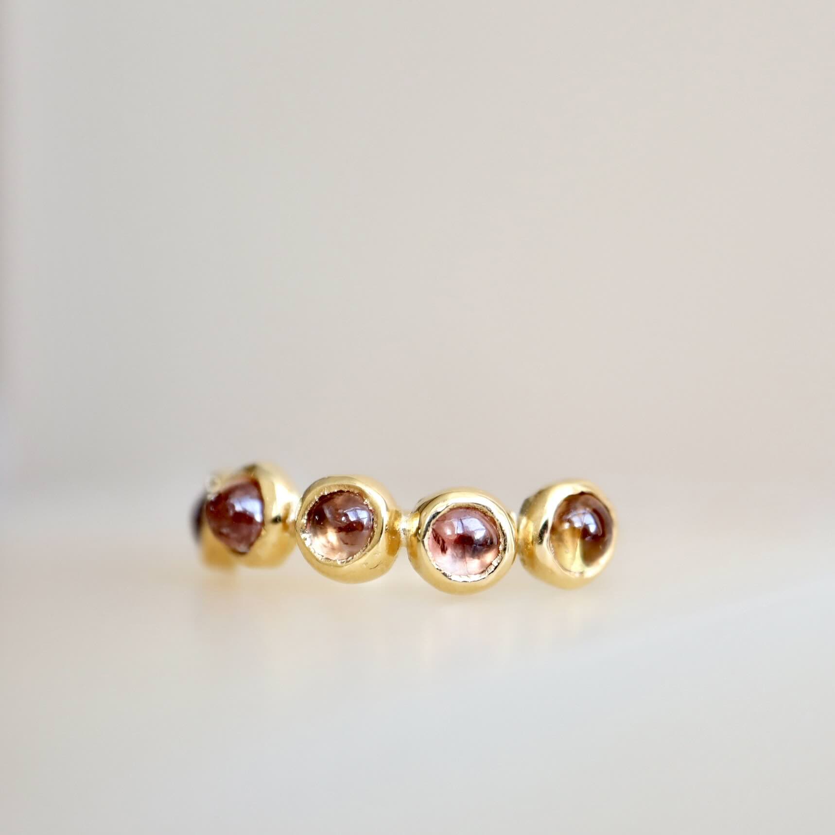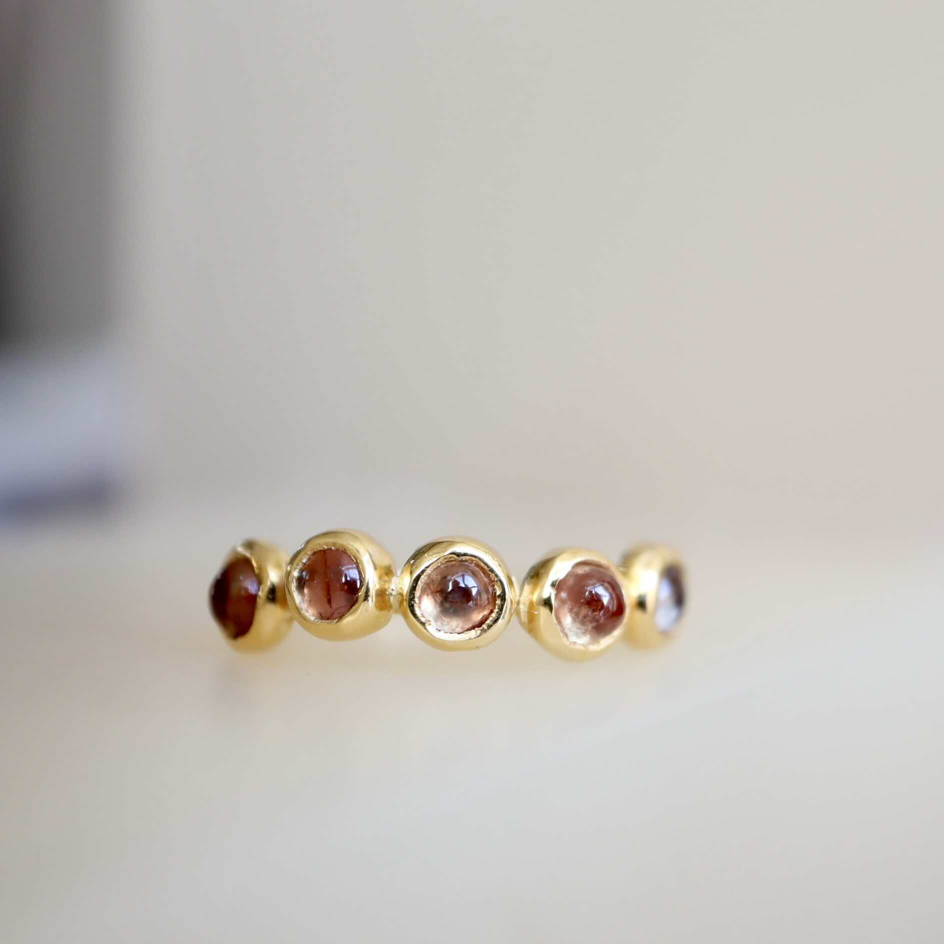 Een kroon van vijf siroop kleurige saffieren in een ring van 22 en 14 karaat goud. De saffieren lijken licht te geven en zijn zó zacht van tint, heel warm.