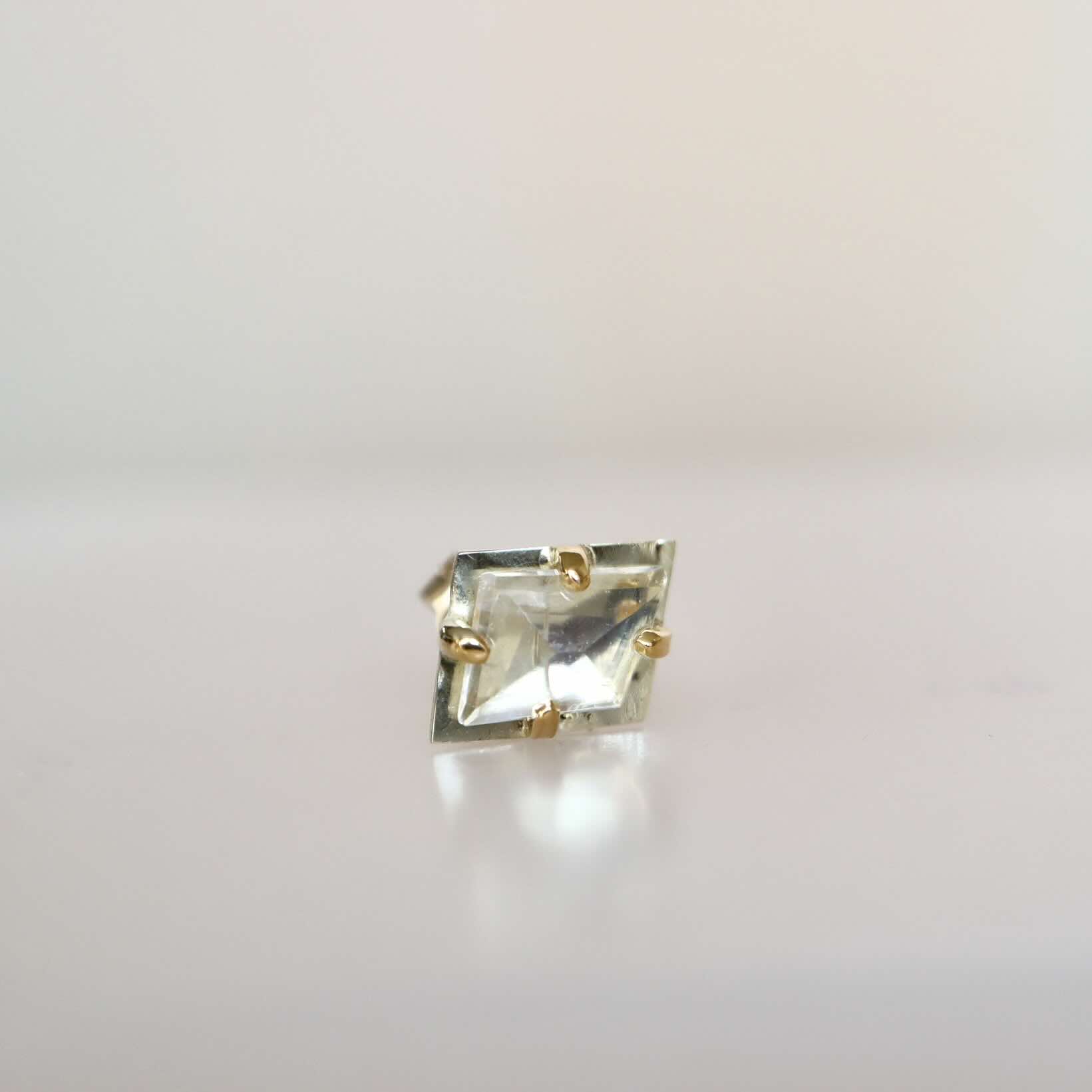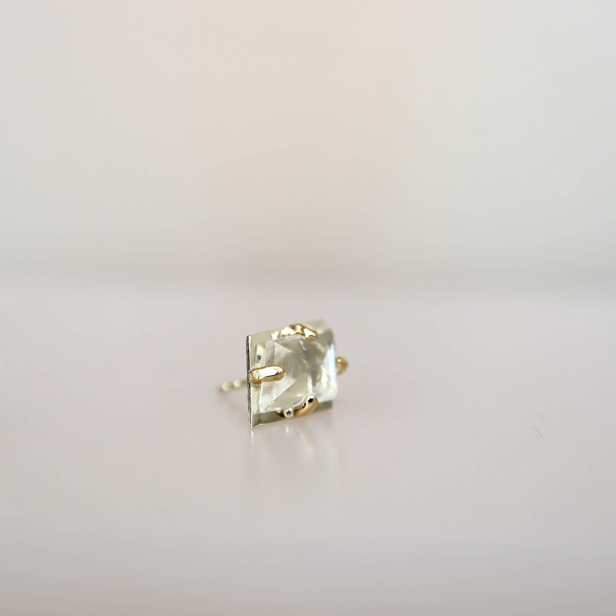 Een enkele steker met een gouden plateau, vier pootjes en een hele mooie maansteen. De oorbel is gemaakt van 22 en 14 karaat goud.