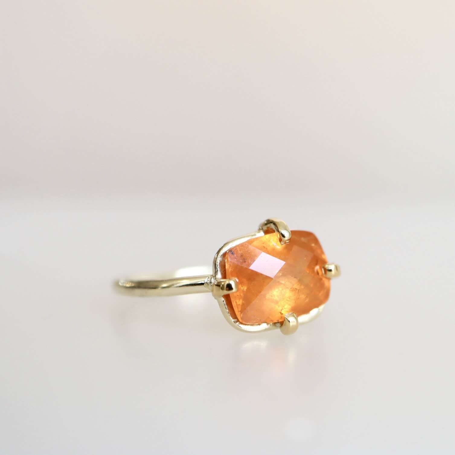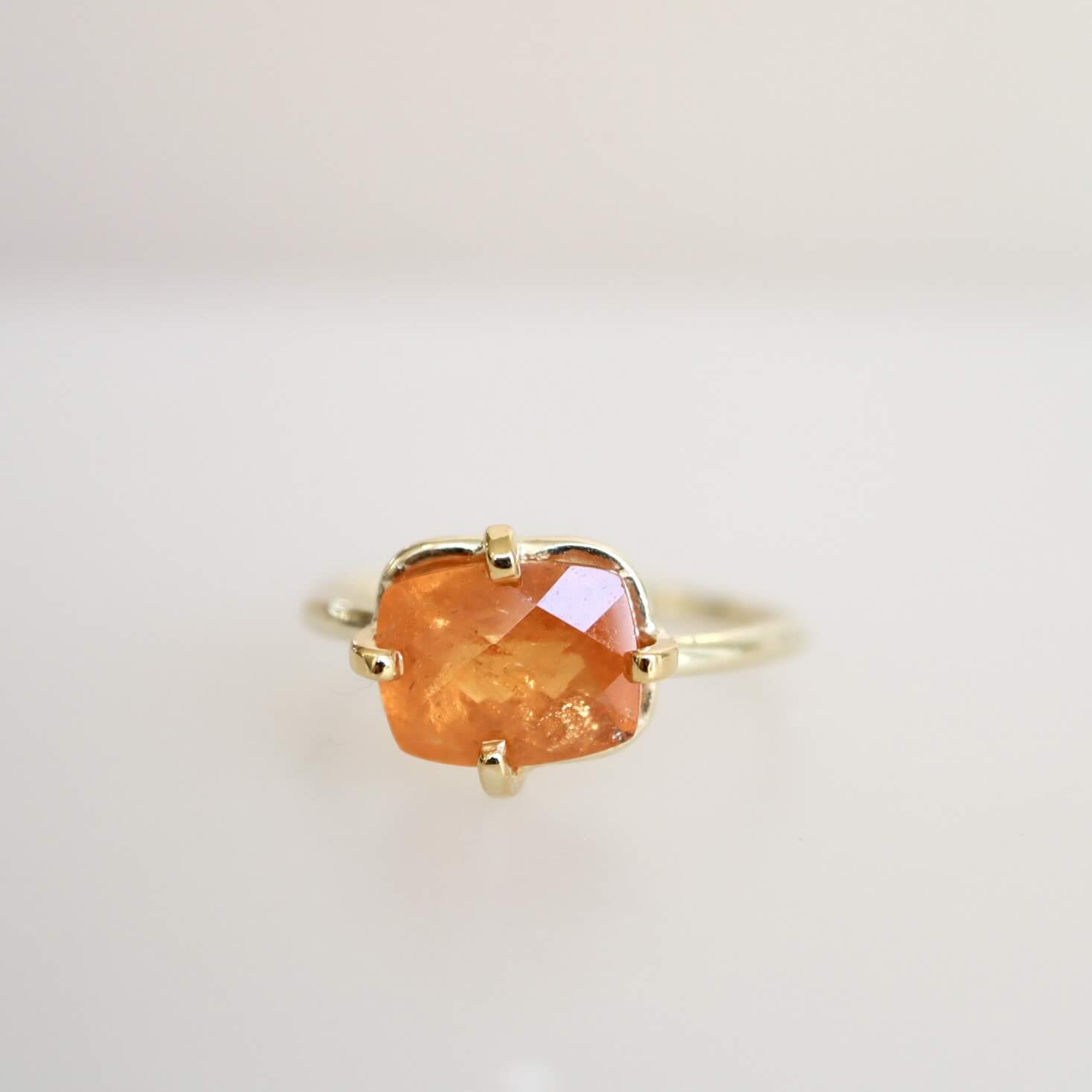 Een indrukwekkende mandarijn granaat in een rechthoek rosecut geslepen. Héél mooi in een 22 karaat zetting van 4 pootjes. De ring is gemaakt van 14 karaat goud.