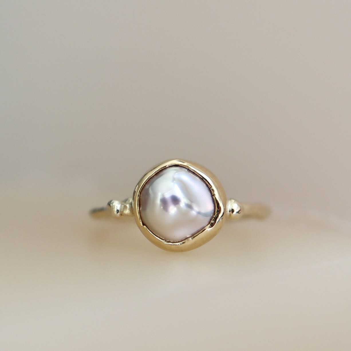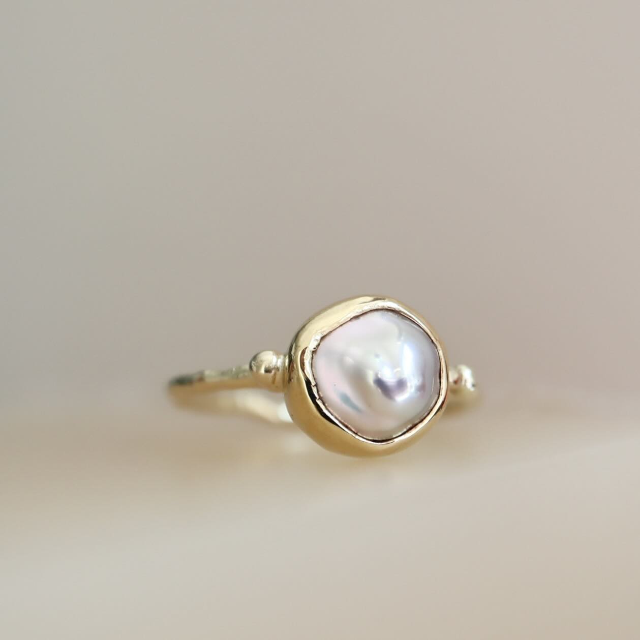 Een swirl zoetwaterparel in een prachtige, 22 karaat gouden zetting met bolletjes goud. Tijdloos mooi! De ring is gemaakt van 18 karaat goud.