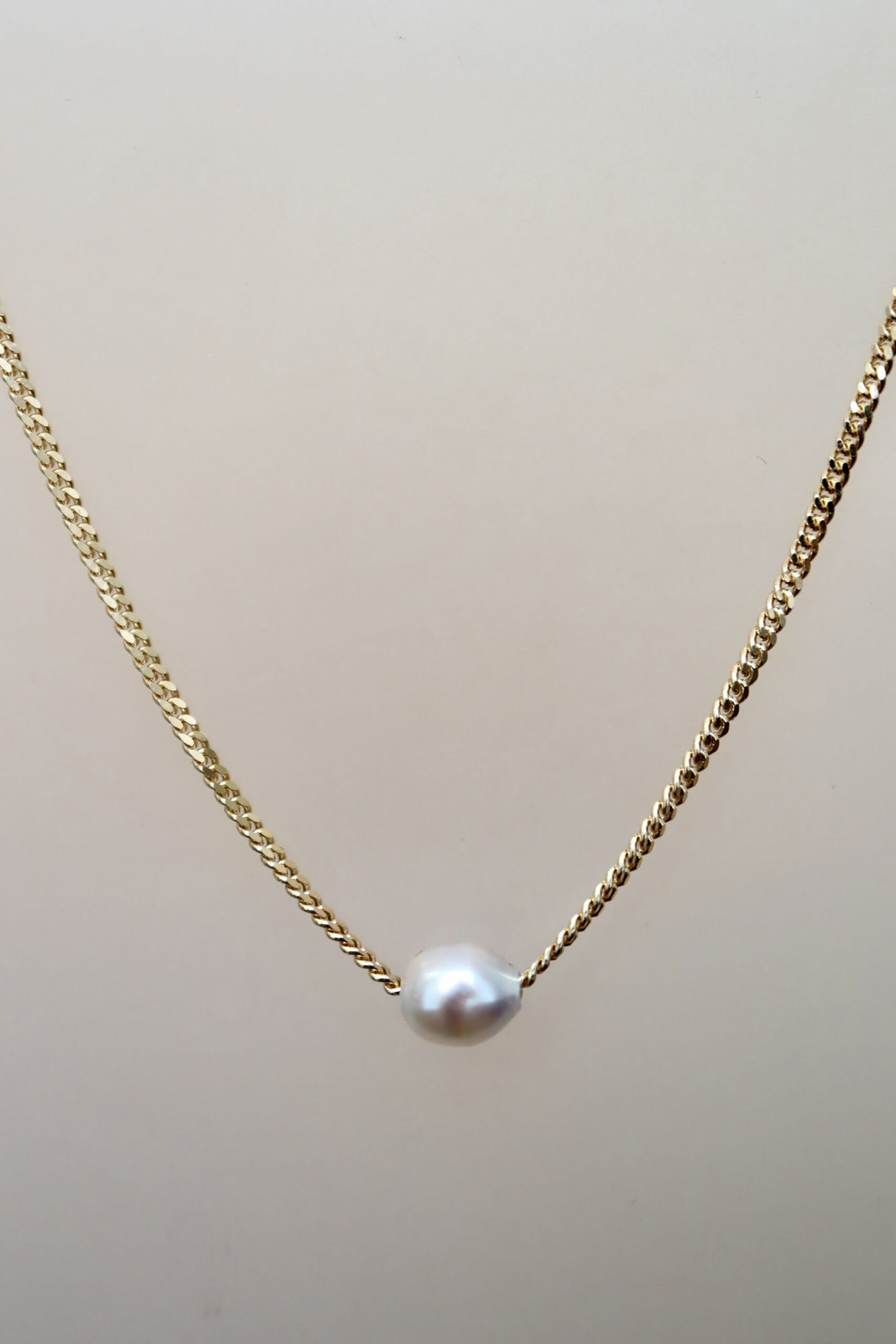 Een verfijnd collier van gourmette schakels, prachtig glanzend en soepel. Gemaakt van 18 karaat goud. Met een lichtgrijs akoya pareltje dat over de schakels schuift.