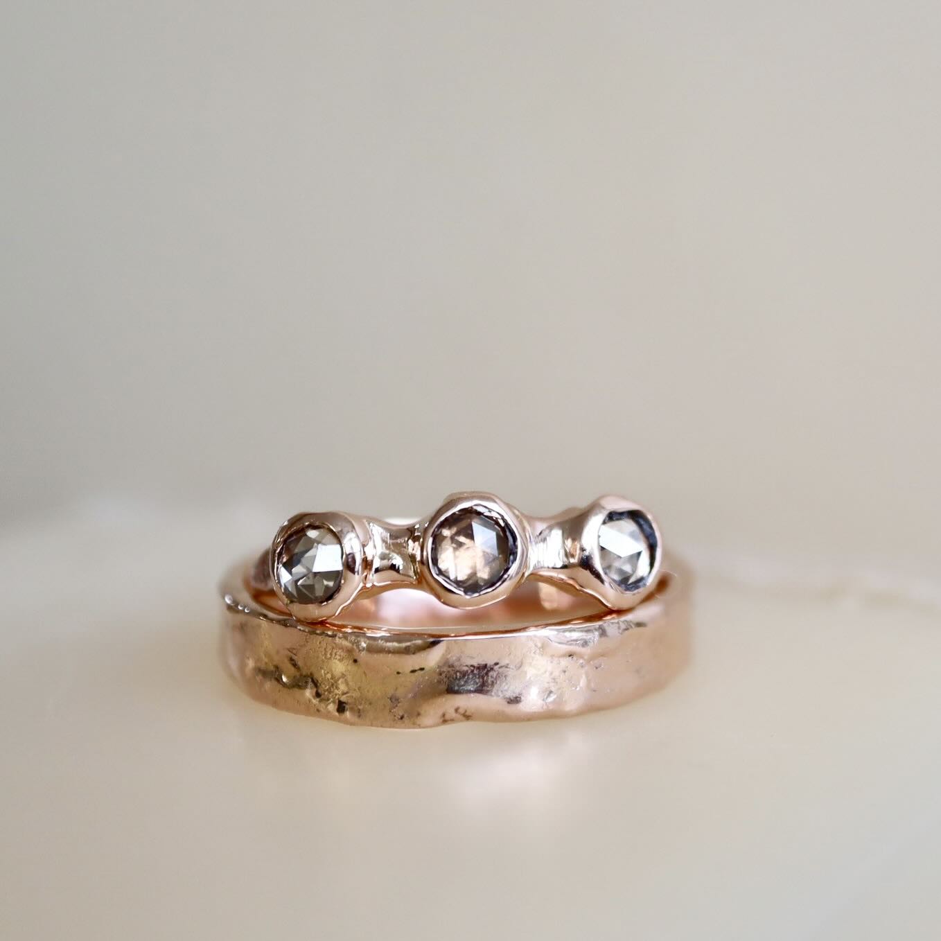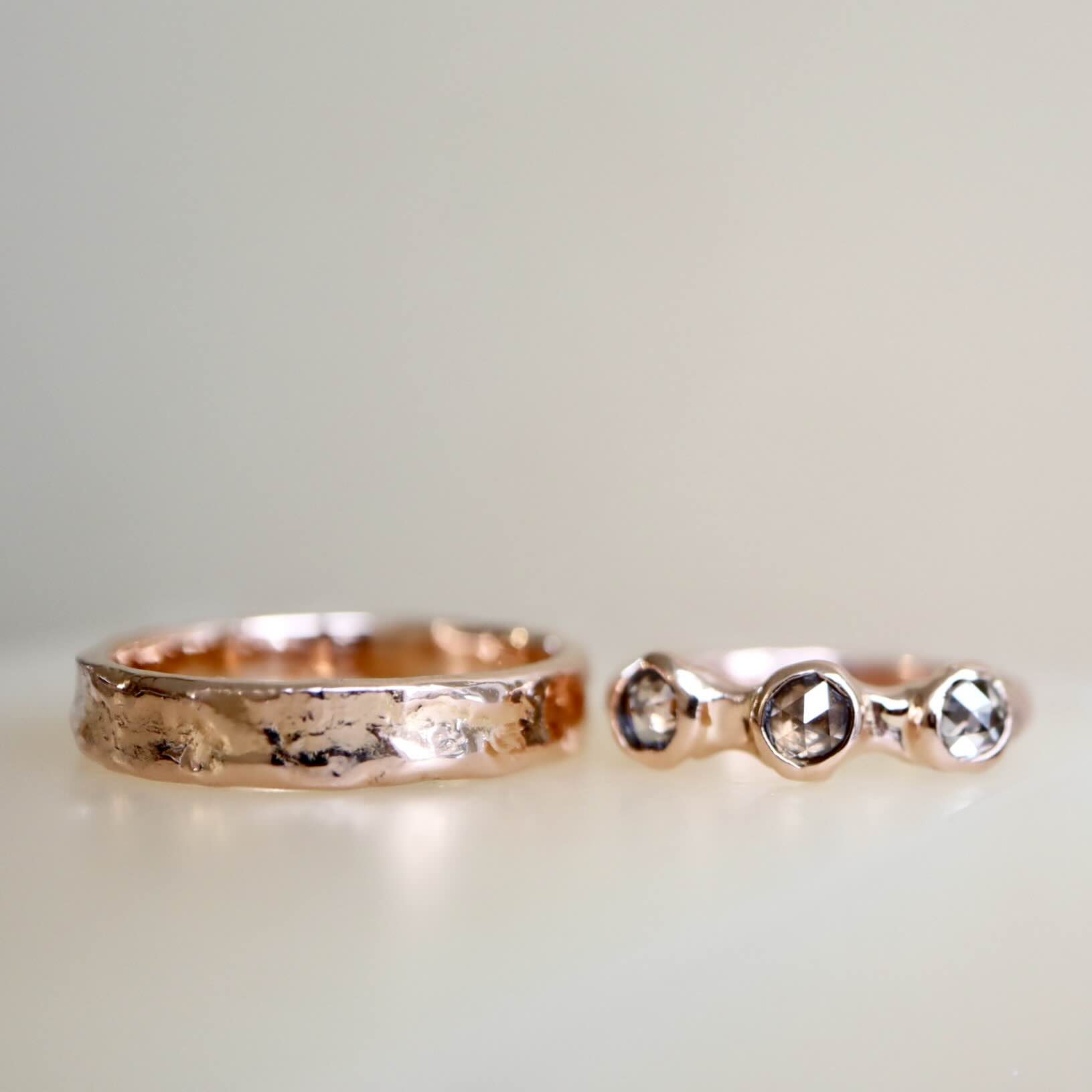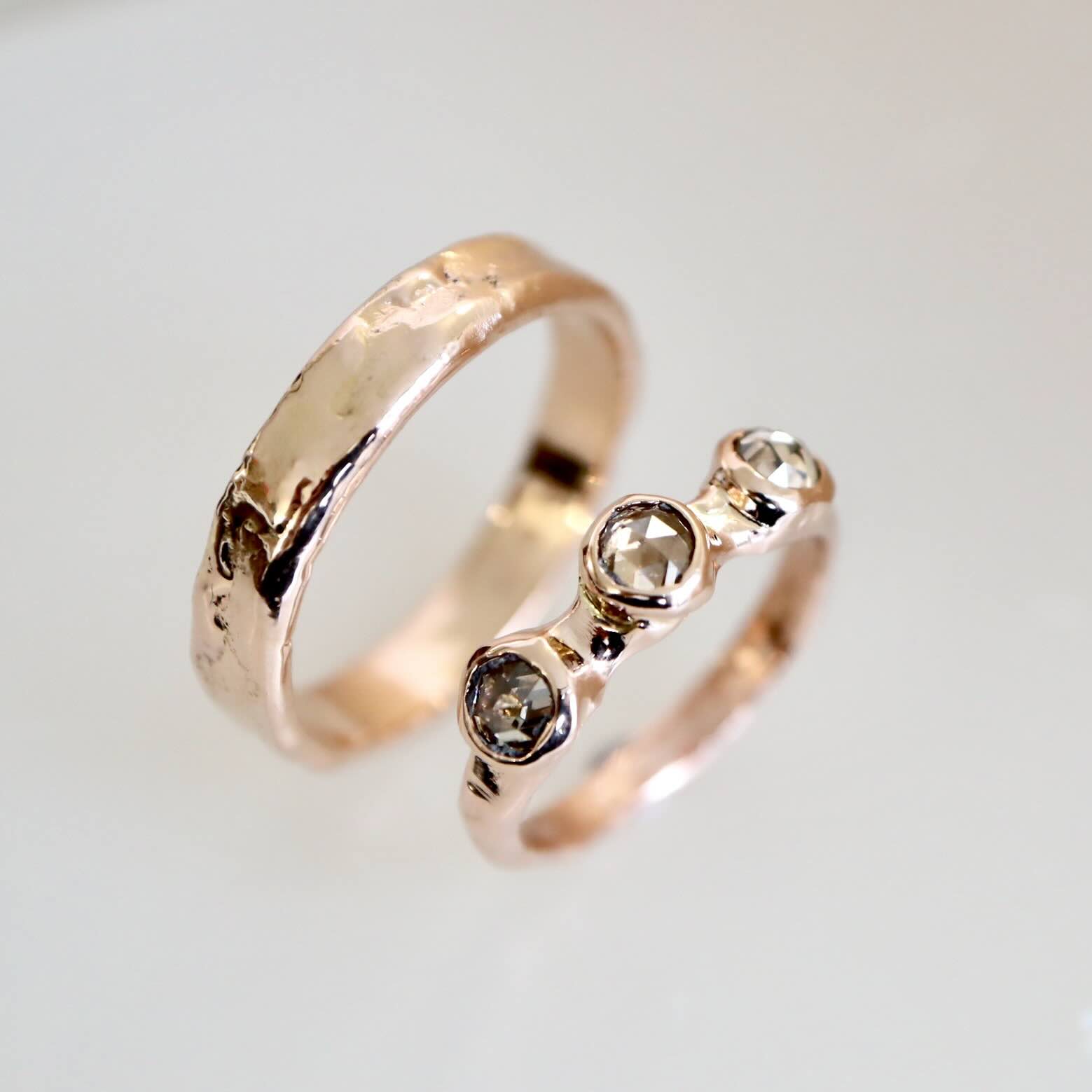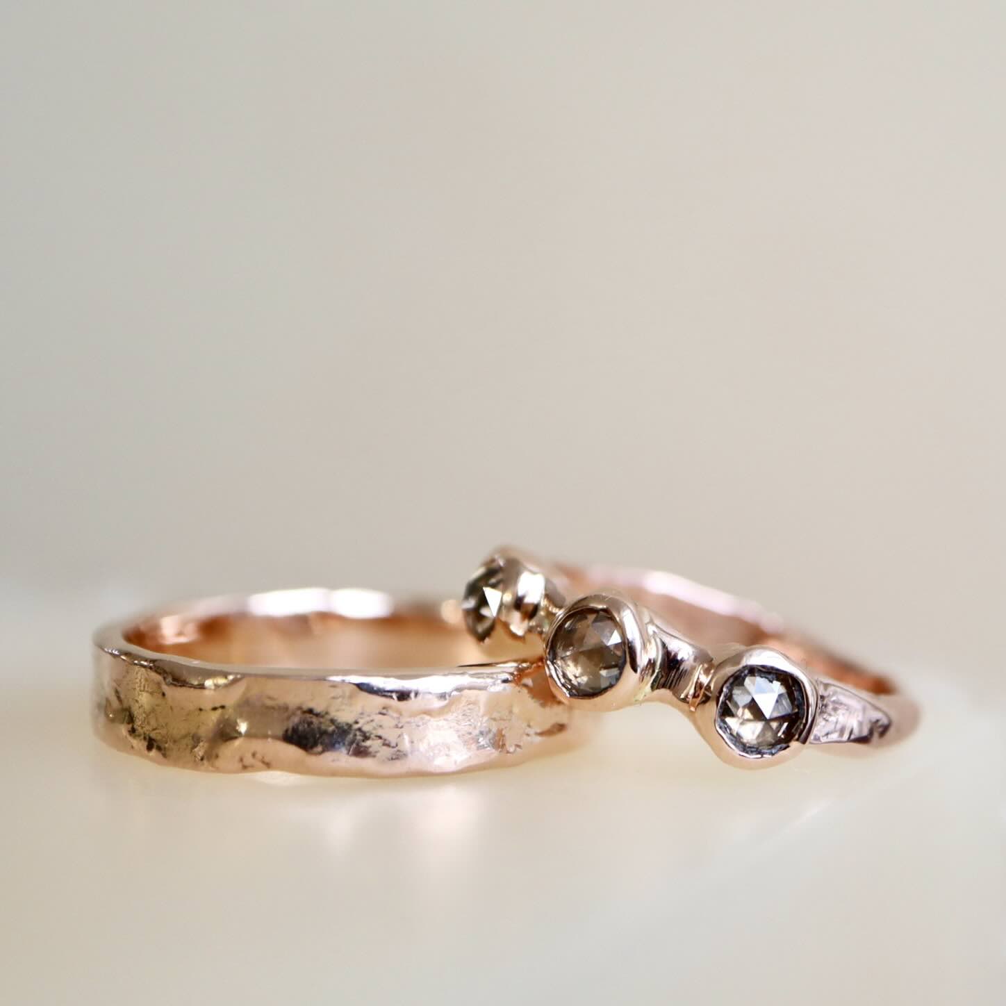 Een 14 karaat roodgouden set ringen; waarvan één ring met fantastisch schitterende diamanten, rosecut. De diamanten zijn samen 0.77 ct. en hebben een champagne tint. Dit combineert geweldig met het roodgoud.
