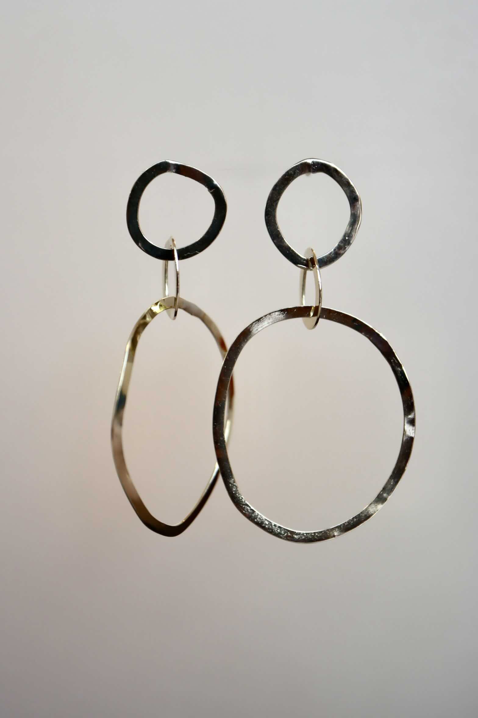 Hamerslag oorbellen van 14 karaat goud, drie ringen onder elkaar. Handmade, lichtgewicht en feest! De onderste ring is groot, ongeveer 3,4 cm.
