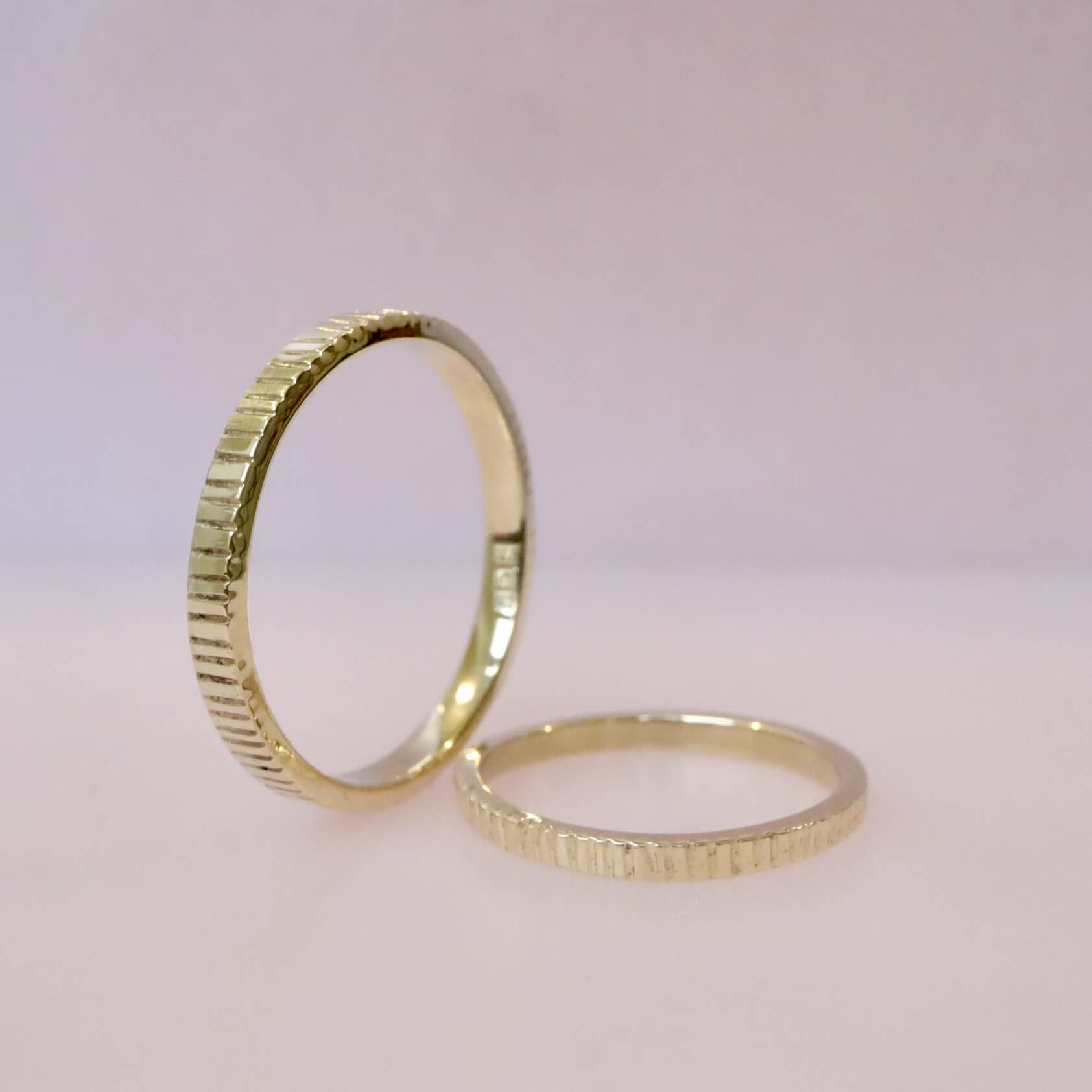 Een ring van 14 karaat goud met een ponsslag bewerking, een prachtige ringen set! Met veel glans effect en lichtweerkaatsing.