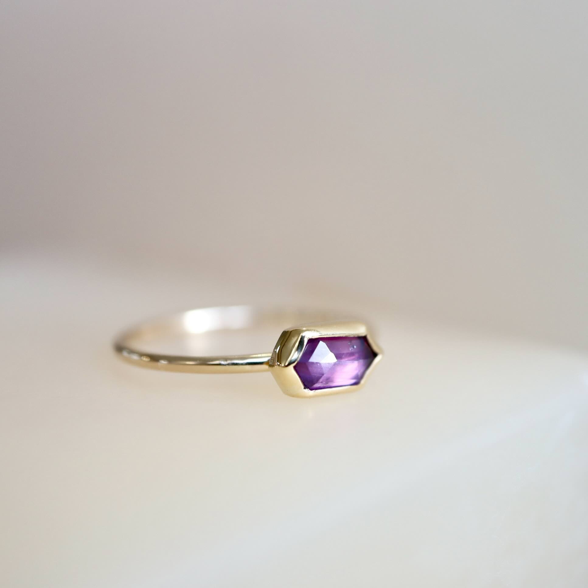 Een saffier in een indrukwekkende dieproze tint. De zes-hoek vorm wordt omvat door een robuuste zetting van 22 karaat goud. De ring is gemaakt van 18 karaat goud.