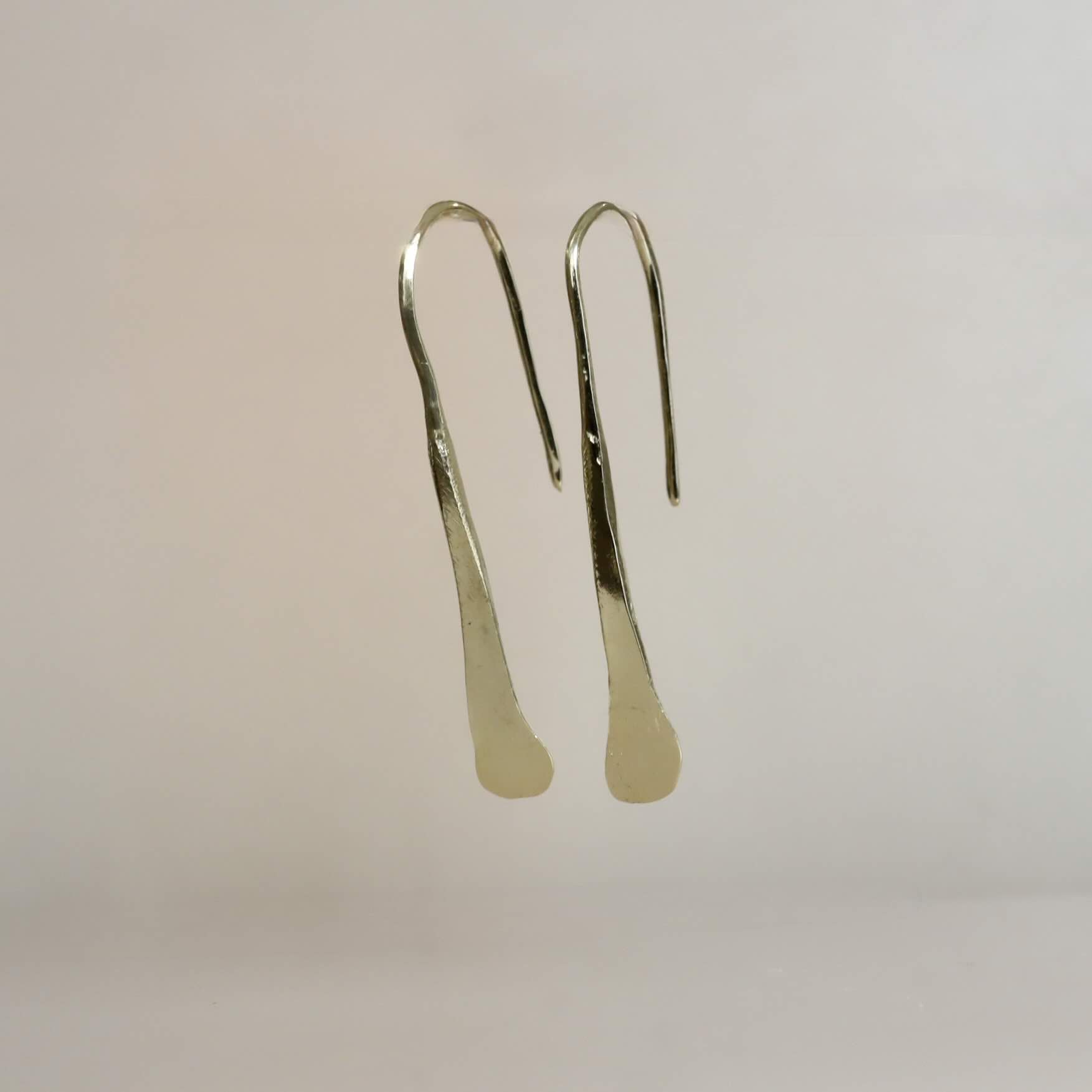 Een 14 karaat gouden, lange druppel met een hamerslag bewerking. Een elegante, lichtgewicht oorbel met een smashing effect.