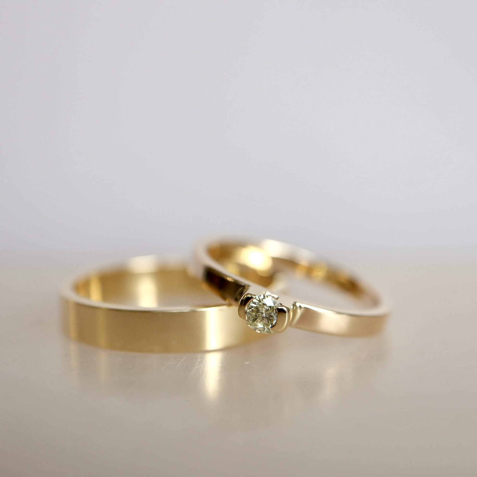 Een trouwringen set van 18 karaat gouden ringen.