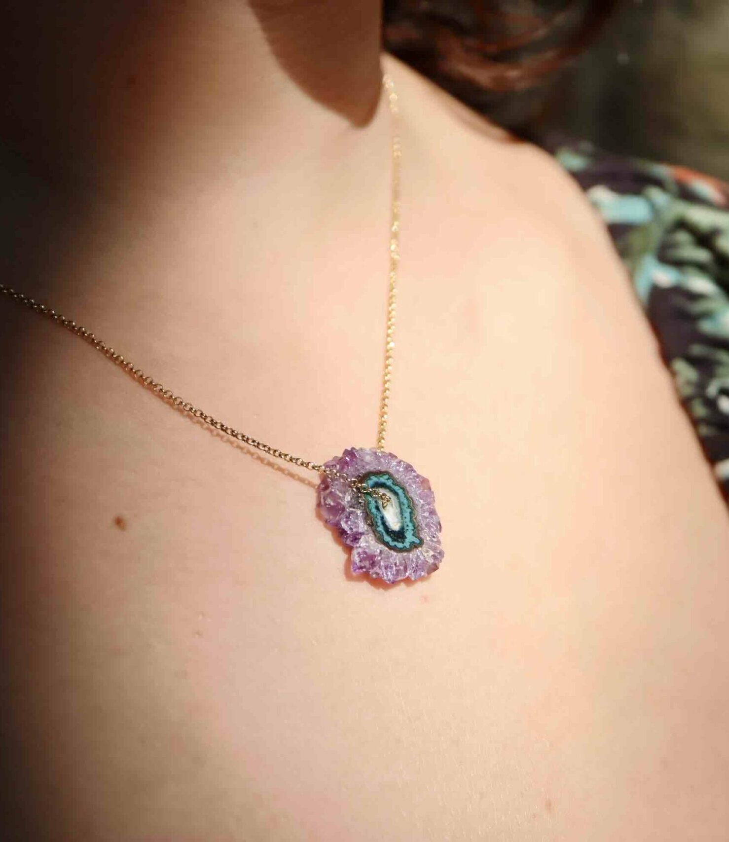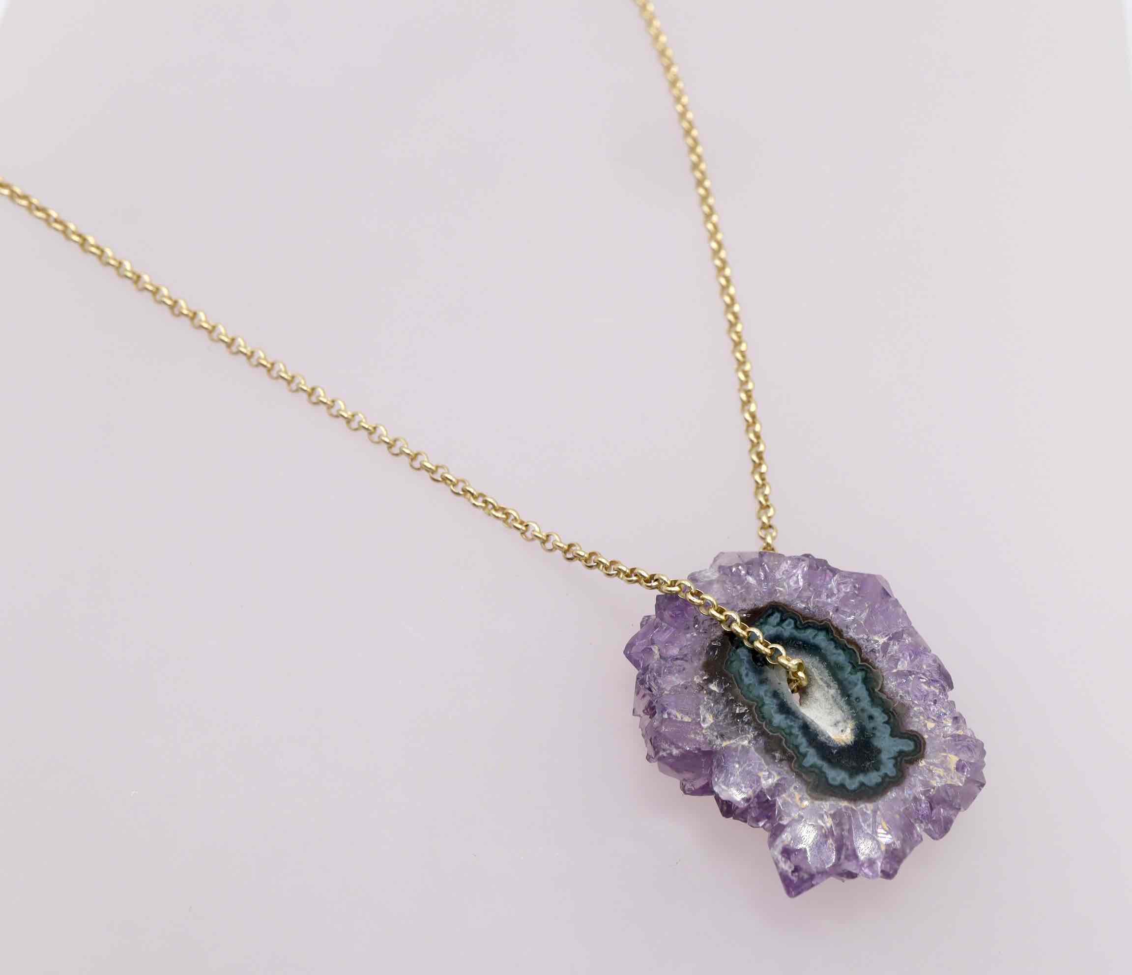 Een slice van een amethyst stalactite, behoorlijk fantastisch, aan een collier van jasseron schakels gemaakt van 18 karaat goud. De amethyst is 26 x 23 mm.