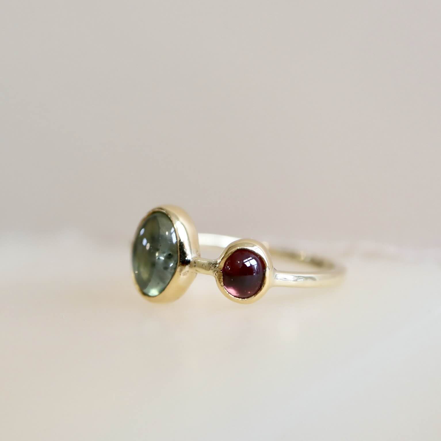 Een lichtgroene en een roze-rode zirkoon, samen lijken ze licht te verspreiden. Een beauty! De ring is gemaakt van 22 en 18 karaat goud.