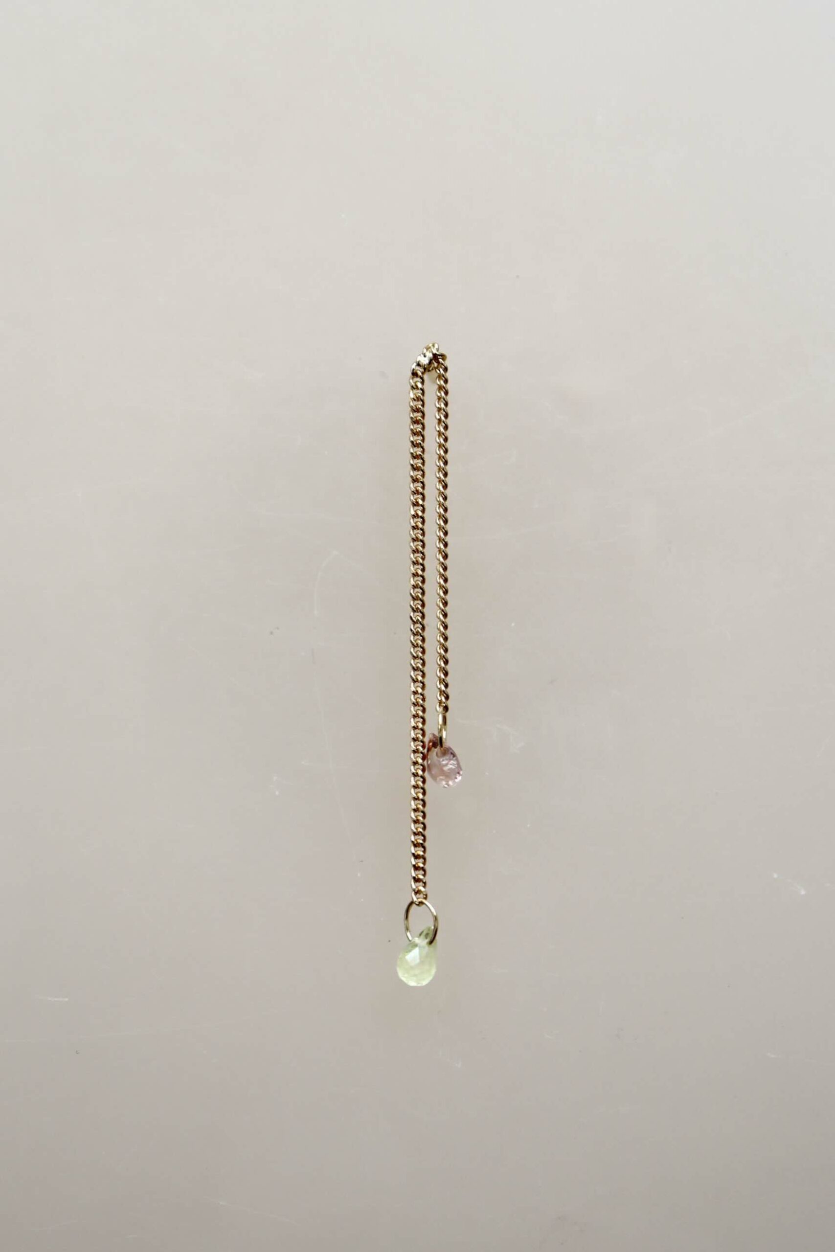 Een enkele oorbel met twee druppel saffiertjes, heel klein en shiny. In de tinten limon en peach. Gemaakt van 18 karaat gouden gourmette schakels.