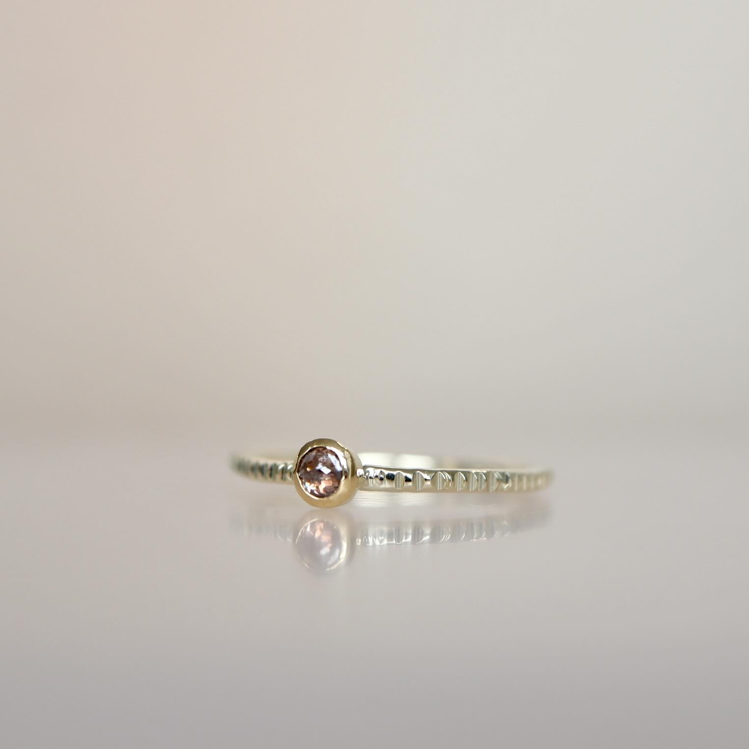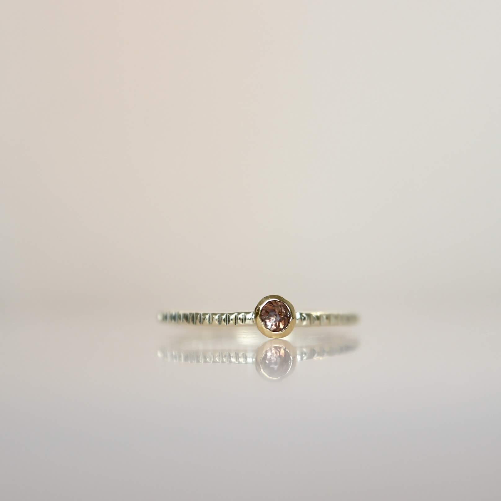 Caramel bruin en heel hard fonkelend, een rosecut diamantje van 0.06 ct. De zetting is gemaakt van 22 karaat goud en de ring, met ponsslag, is gemaakt van 14 karaat goud.