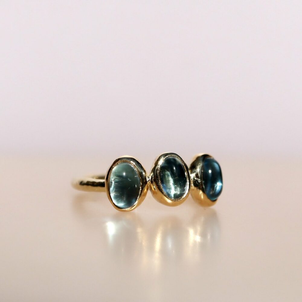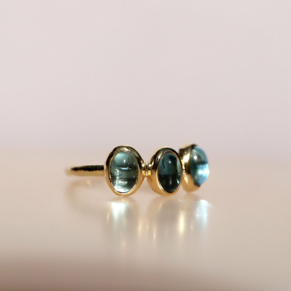 London blue topaz, intens blauw op een rijtje! De drie stenen zijn gezet in 22 karaat goud. De ring is gemaakt van 14 karaat goud.