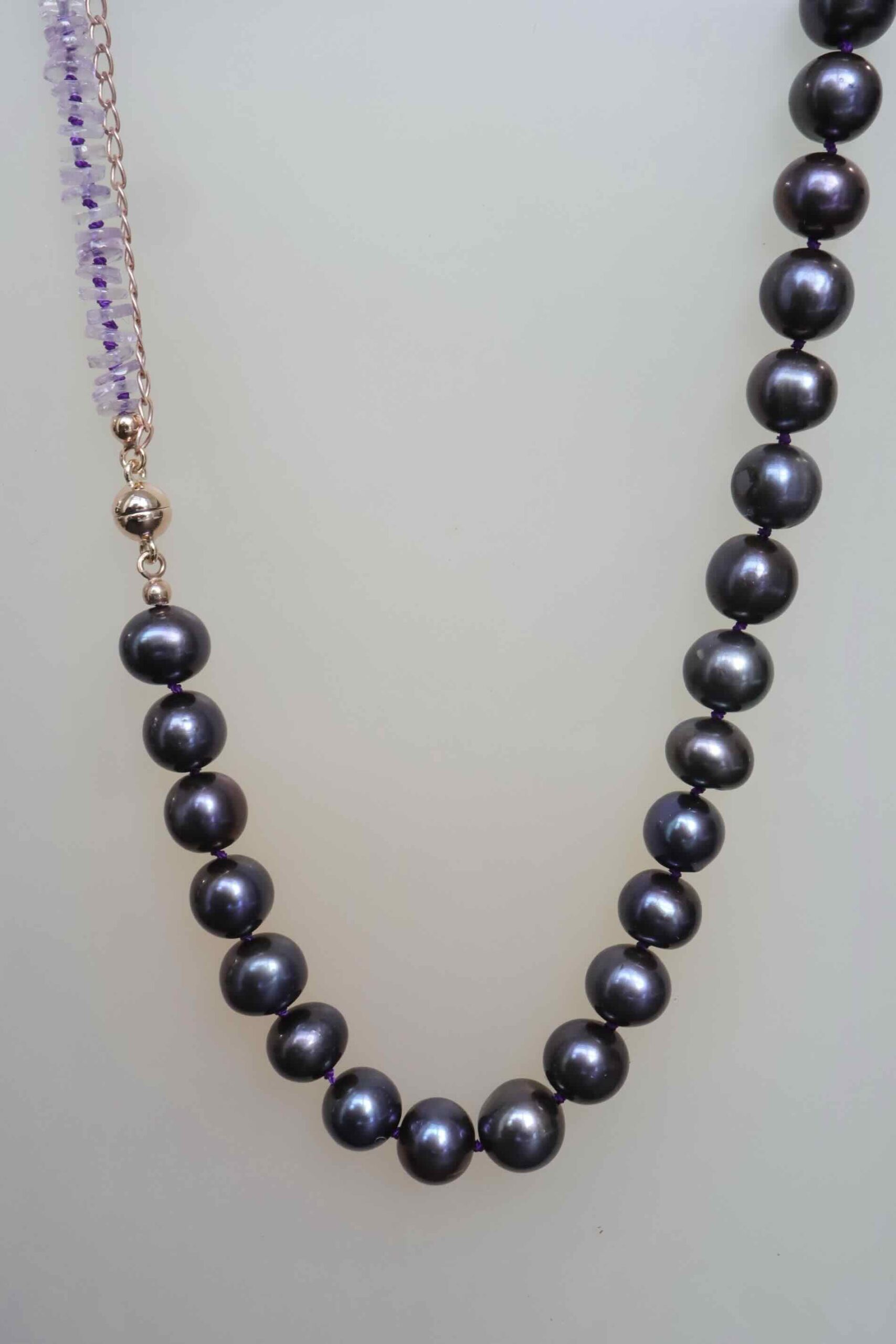 Amethyst dices, gecombineerd met roodgoud gourmette en supermooie zoetwaterparels in een zwart, paarse tint. De sluiting is een magneet bolslot. Het collier is gemaakt met 14 karaat roodgoud.