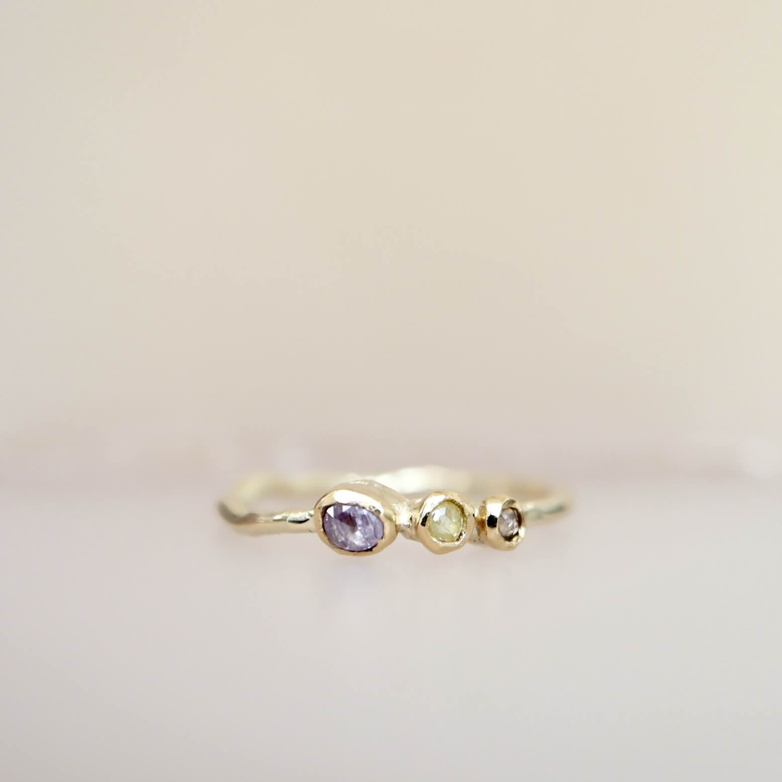 Een roze, geel en bruin diamantje, heel fijntjes gezet in 22 karaat goud dat haast versmolten lijkt met de ring. De ring is gemaakt van 14 karaat goud. De diamantjes zijn samen 0.13 ct.