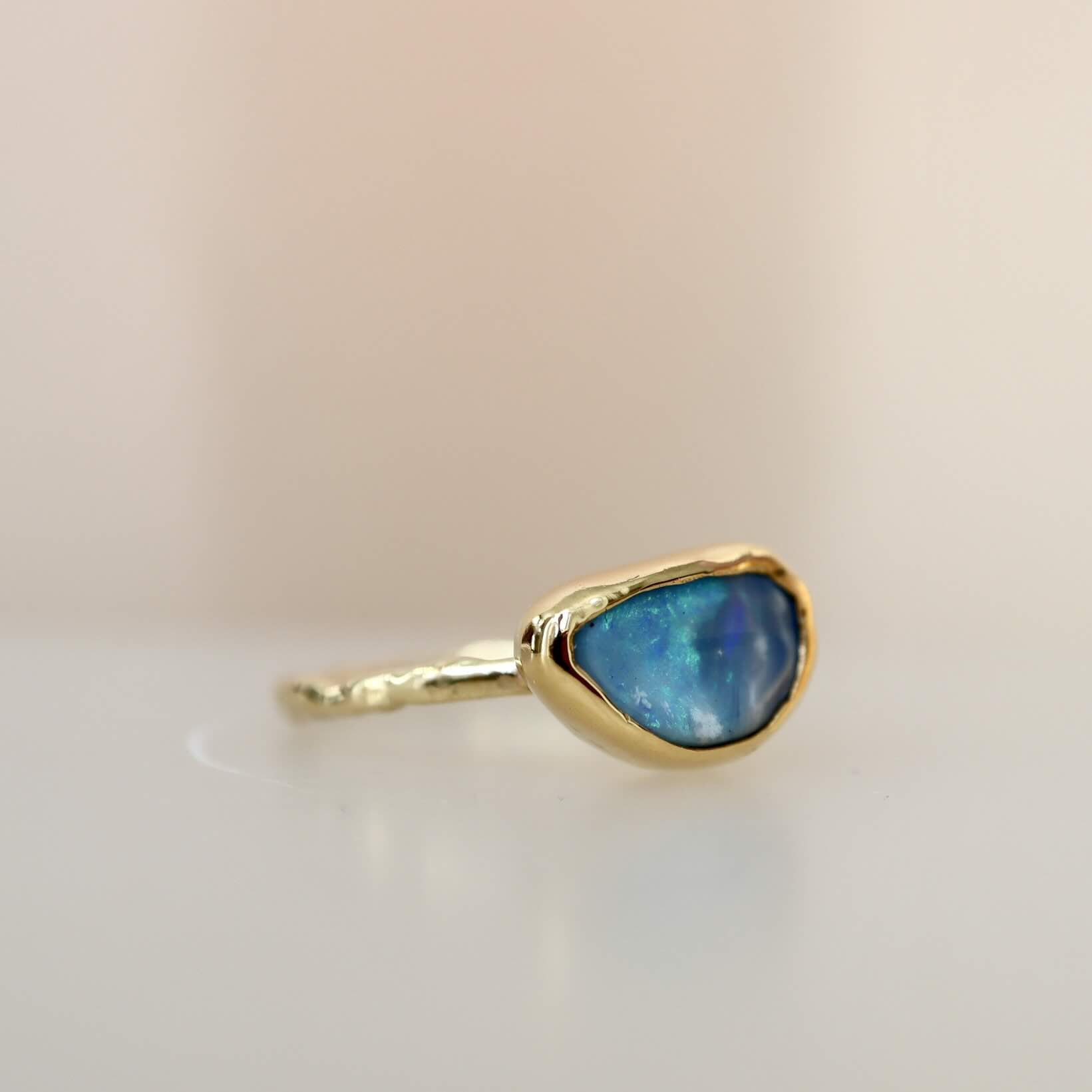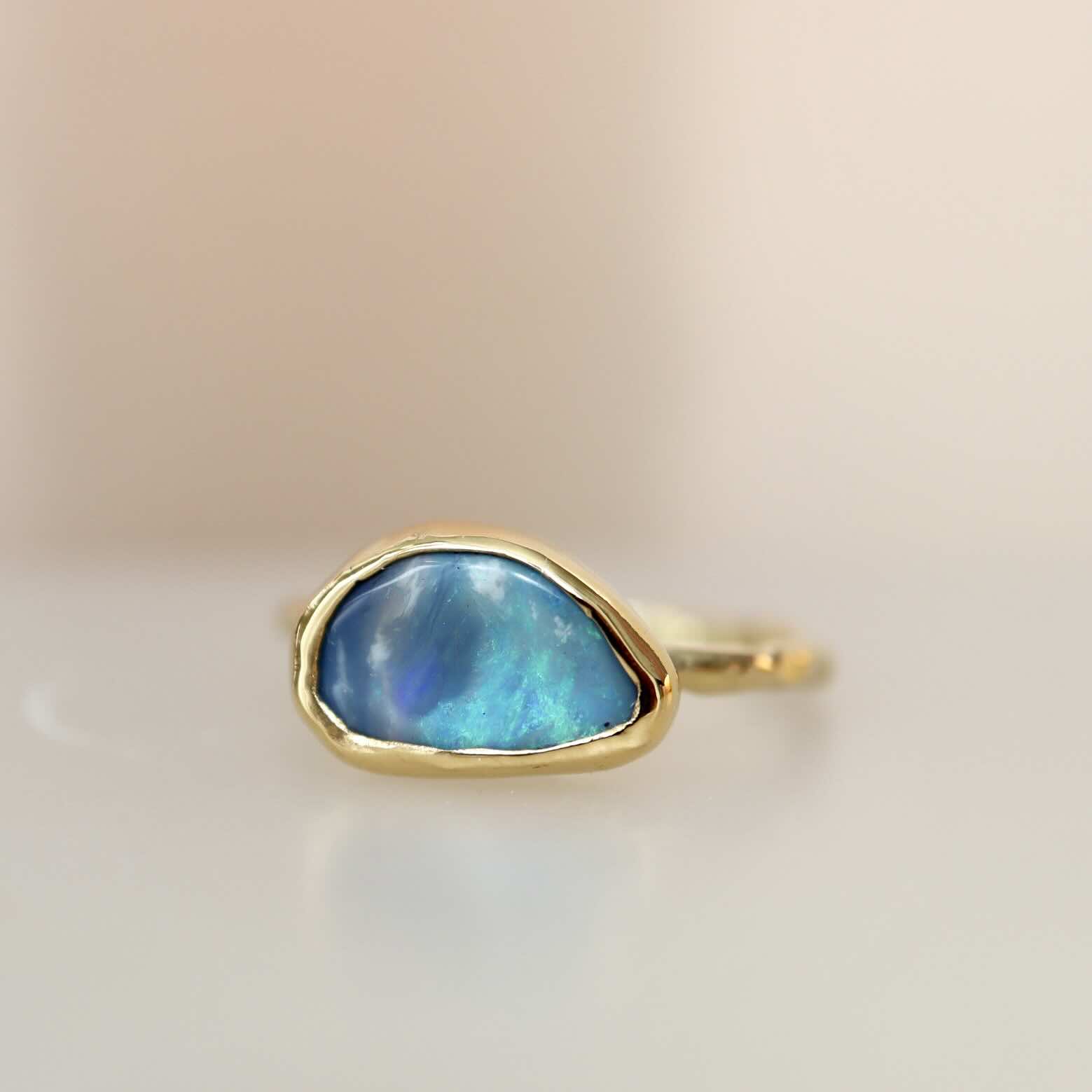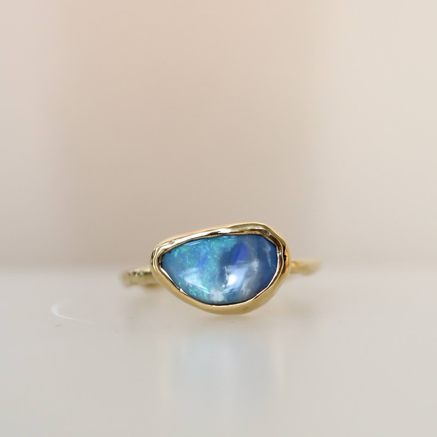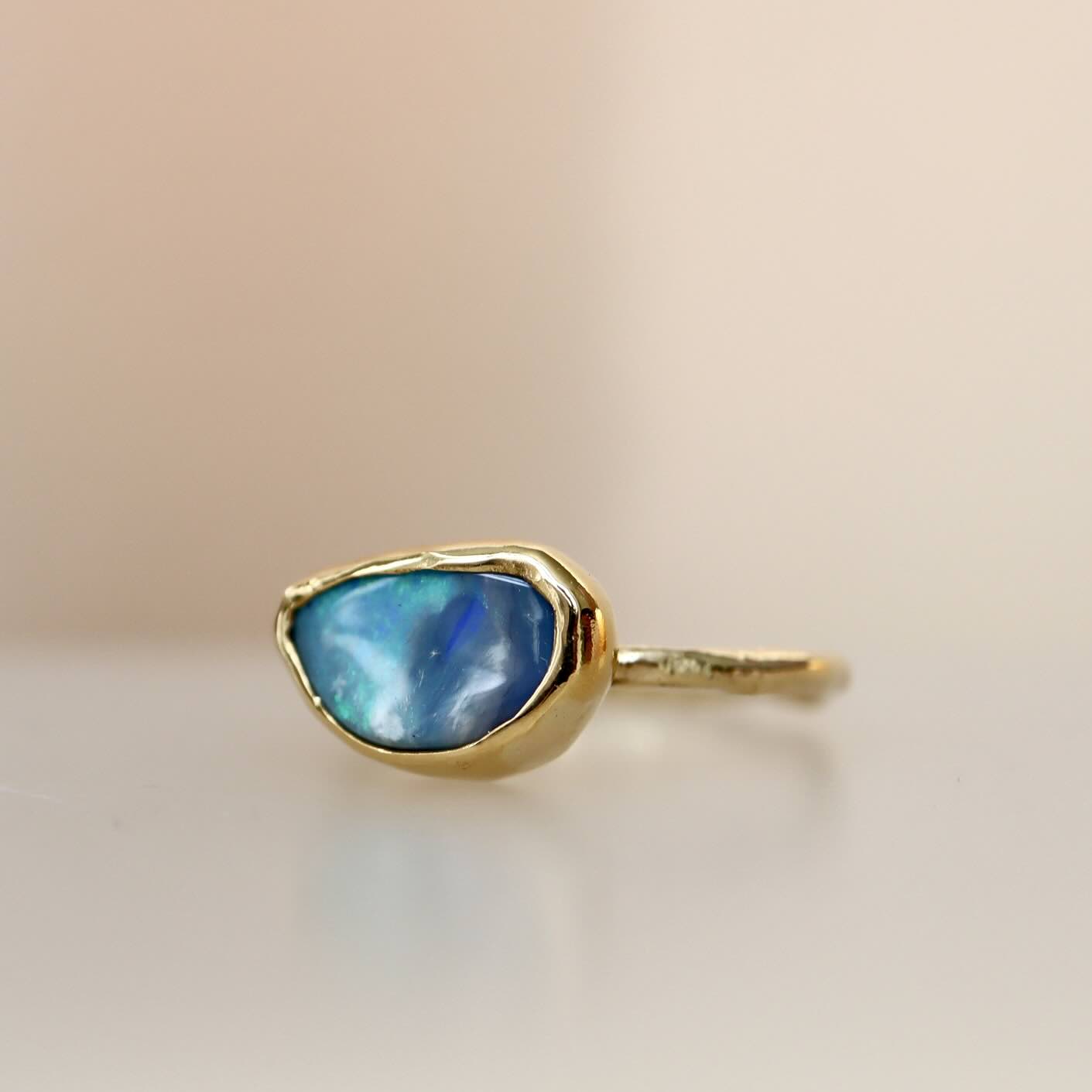 Ow zo mooi! Een opaal in een fantastische caribean blauwe zeekleur. Prachtig gezet in 22 karaat goud. De ring zelf is gemaakt van 14 karaat goud.