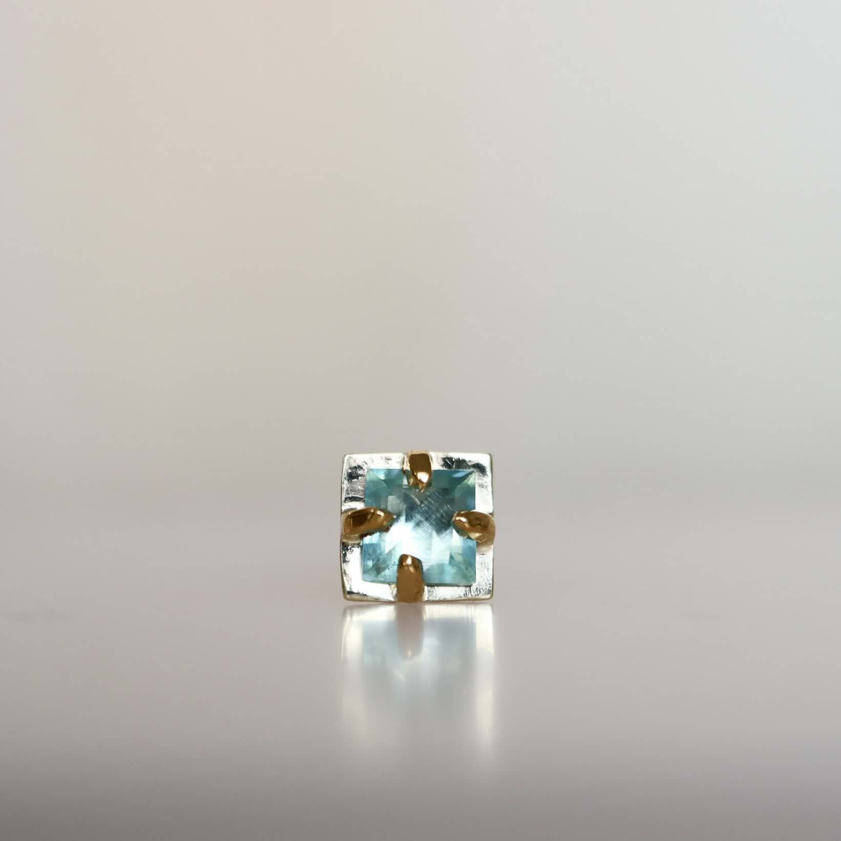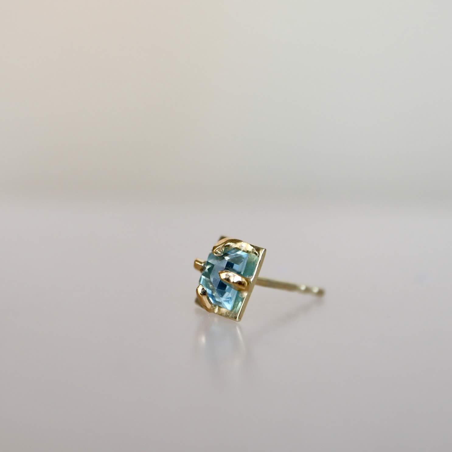 Een helder blauwe topaas met een sterke sprankeling. Royaal gezet op een gouden plateau met vier pootjes. De enkele oorbel is gemaakt van 22 en 14 karaat goud.