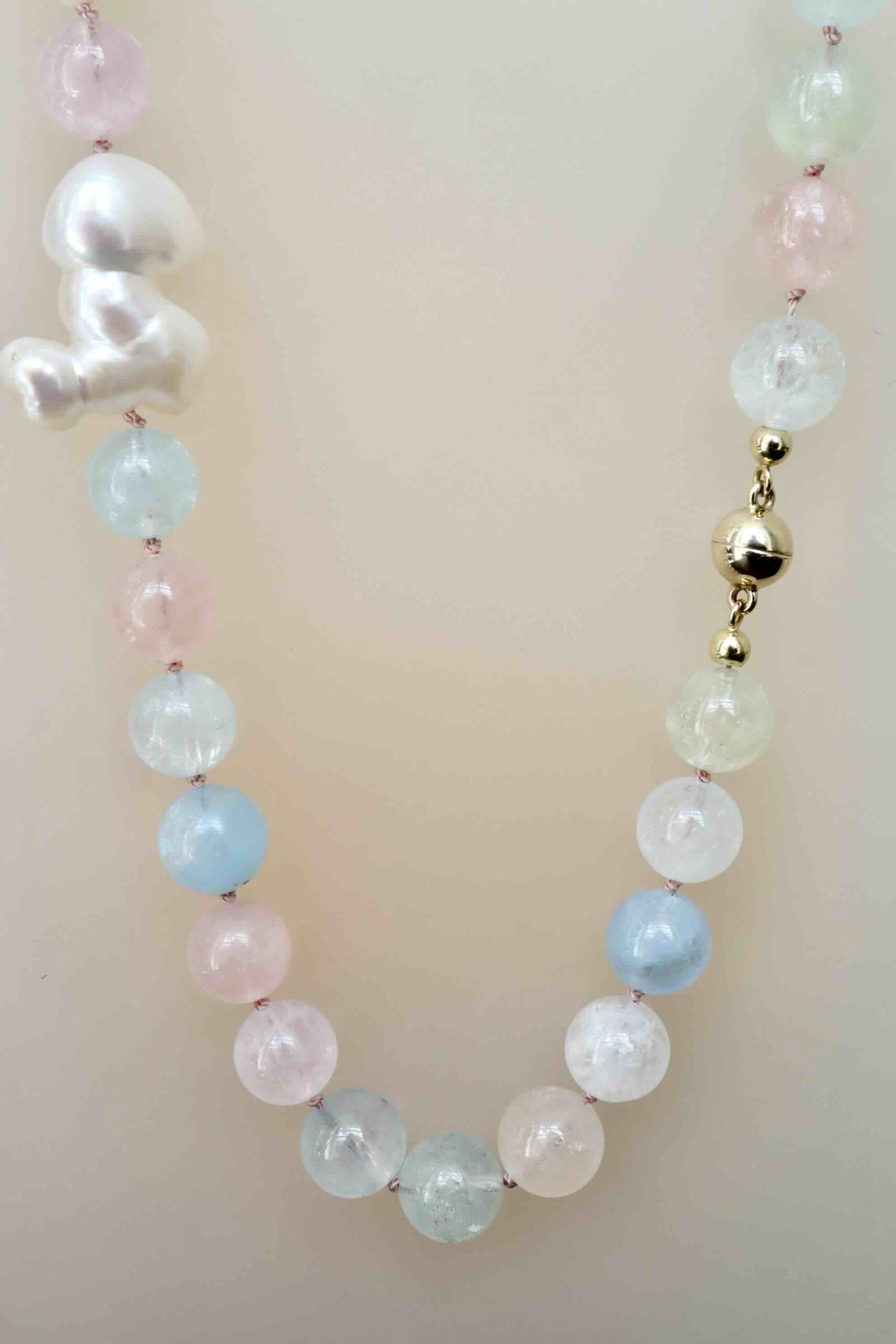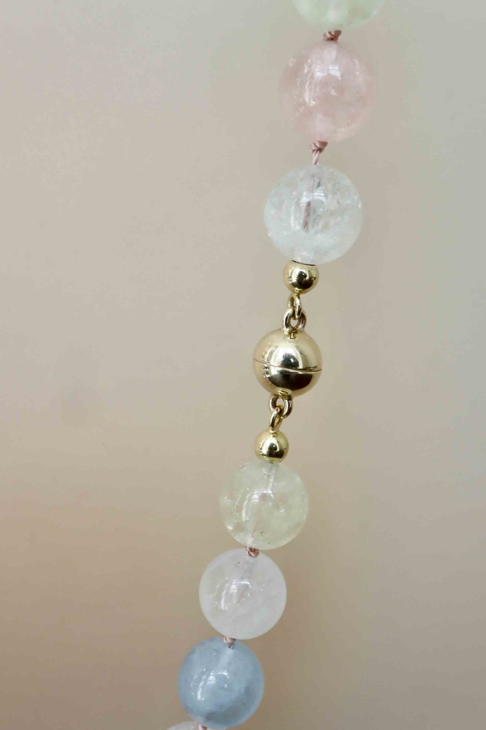 Een smashing combinatie van beryl in zachte pasteltinten met popcorn zoetwaterparels! De sluiting is een 14 karaat magneet bolslot.