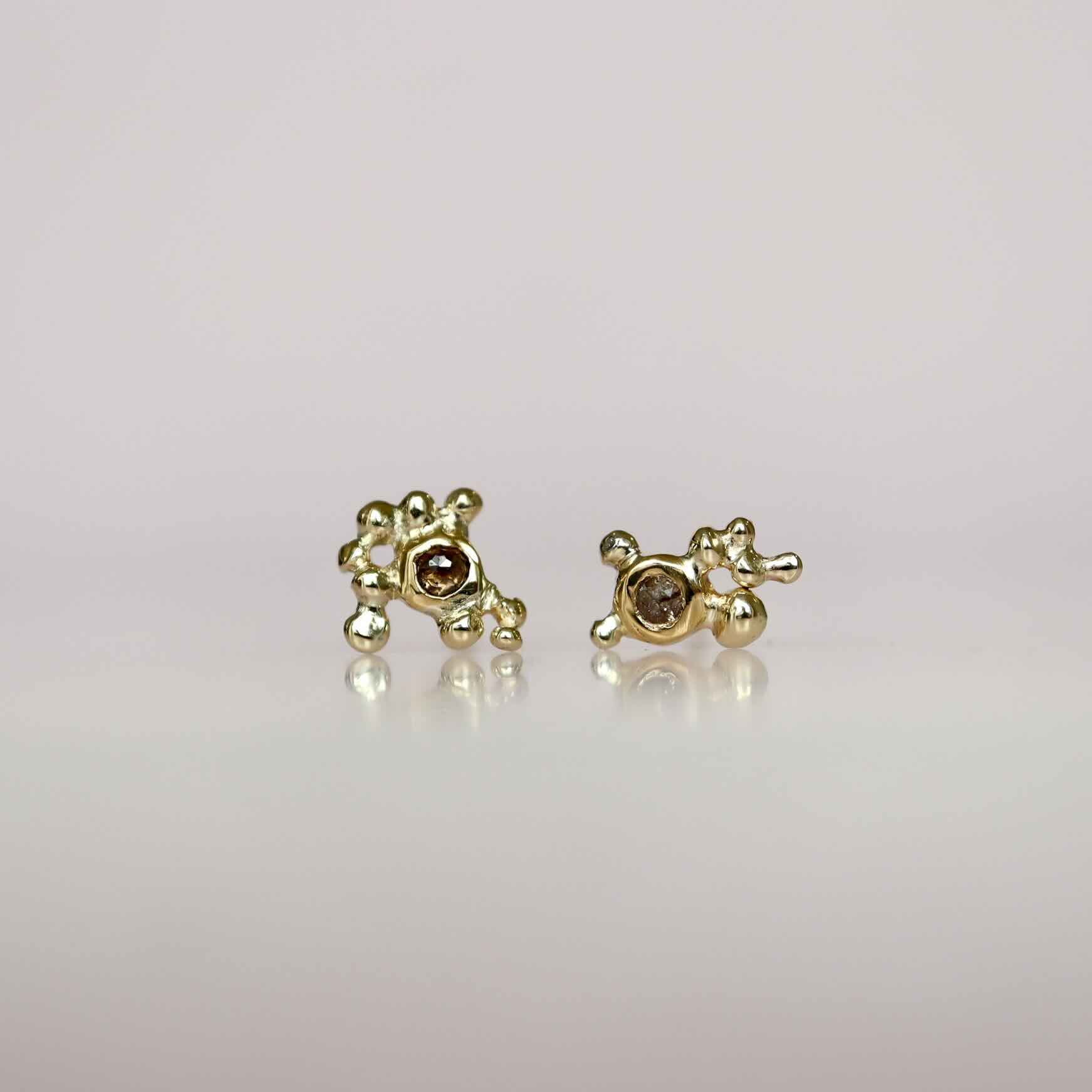 Een mysterieus sprankelend bruin/grijzig diamantje met gouden bolletjes er omheen, als kleine deeltjes dansend om de kern. Het asymmetrische ontwerp maakt maakt deze set oorstekers extra uniek en speels!