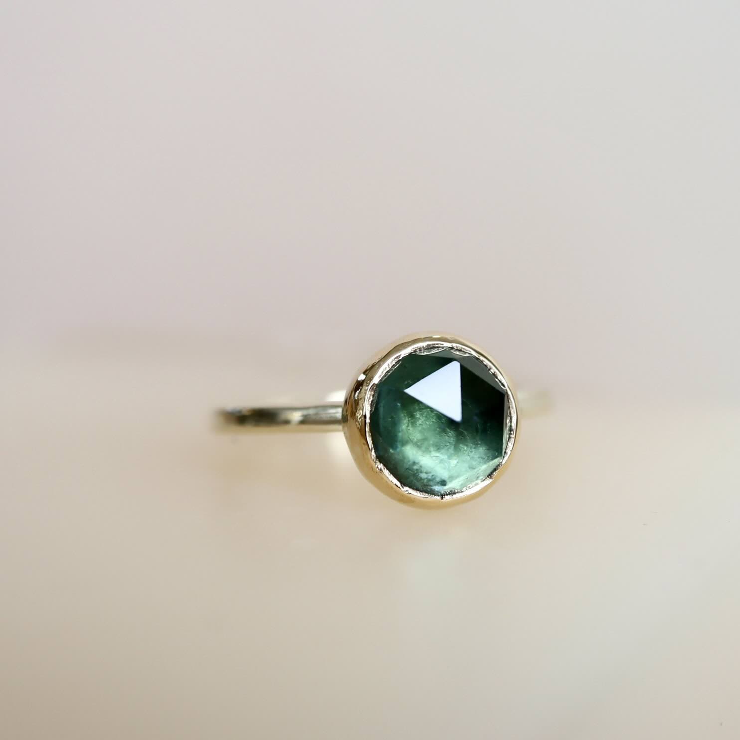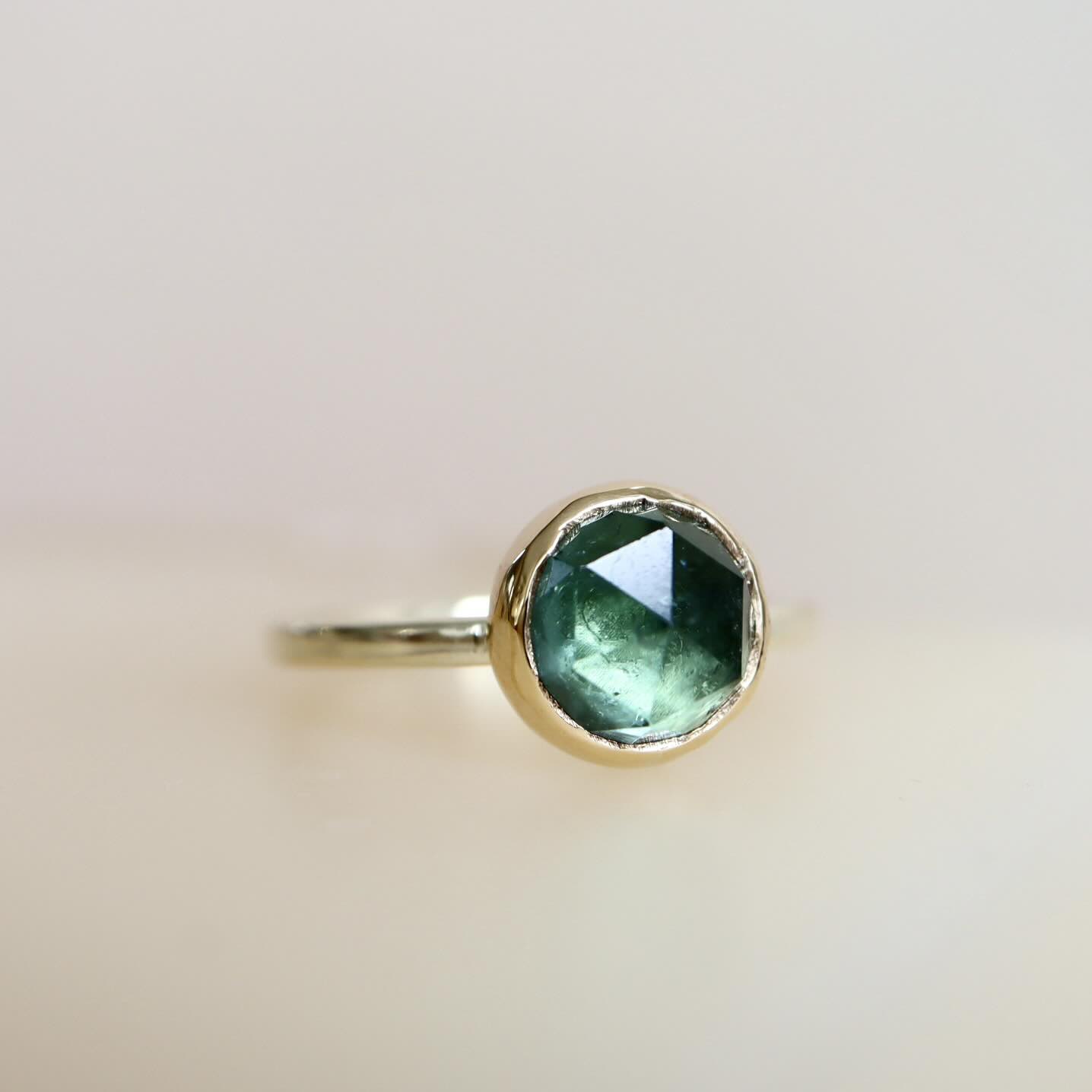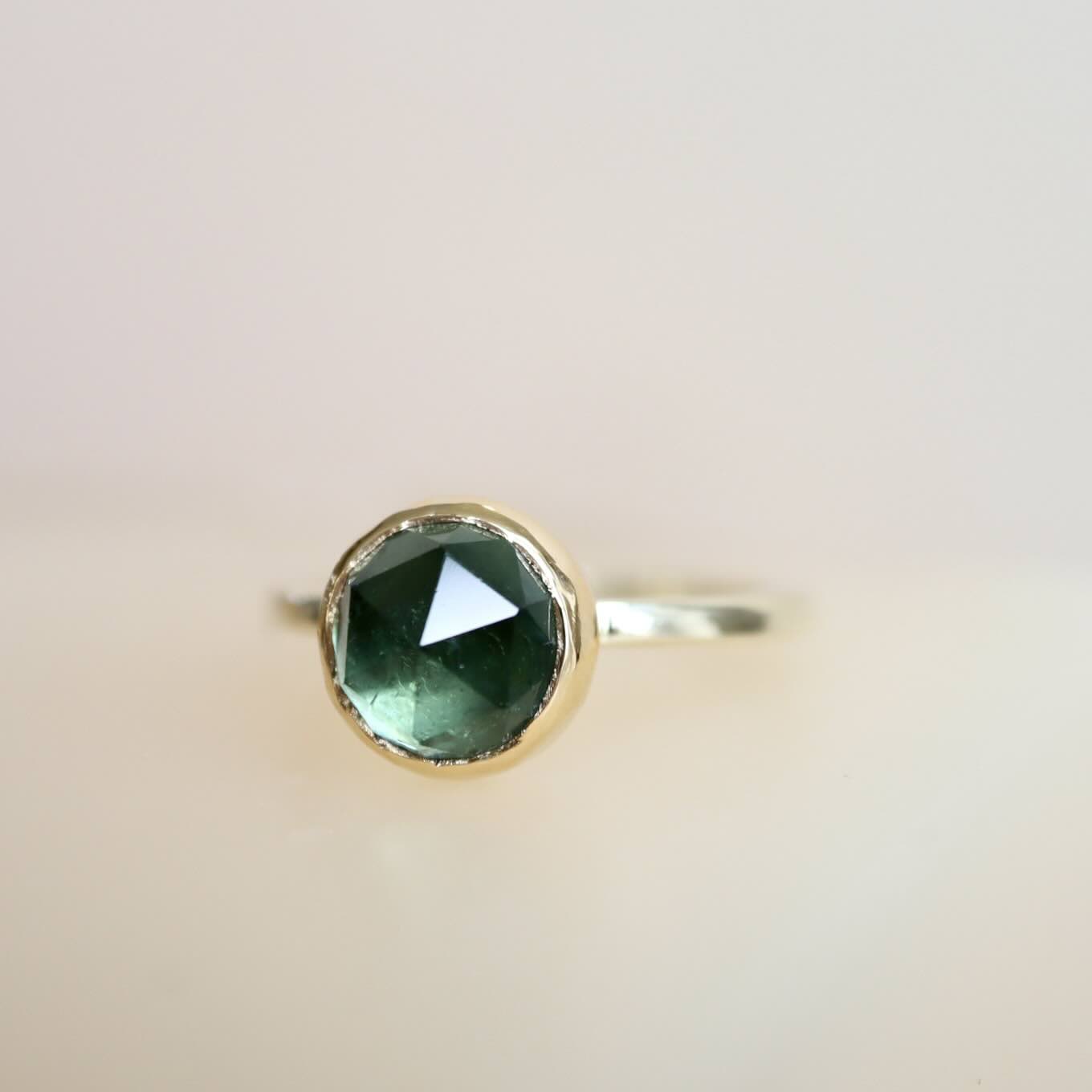Een fantastisch mooie, groene toermalijn, bol en facet geslepen en heerlijk fonkelend. De toermalijn is 2.32 ct. en heeft een zetting van 22 karaat goud. De ring is gemaakt van 14 karaat goud.