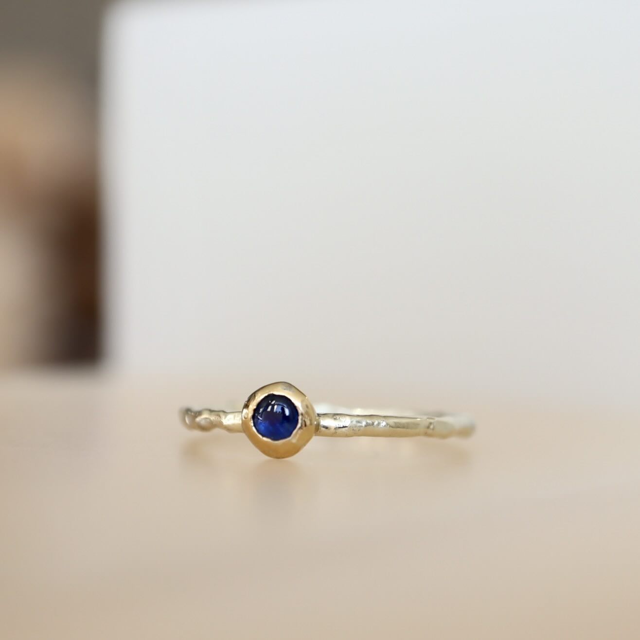 Een donkerblauw saffiertje in een weelderig gevormde, elegante ring. De saffier is 0.18 ct. De ring is gemaakt van 22 en 14 karaat goud.