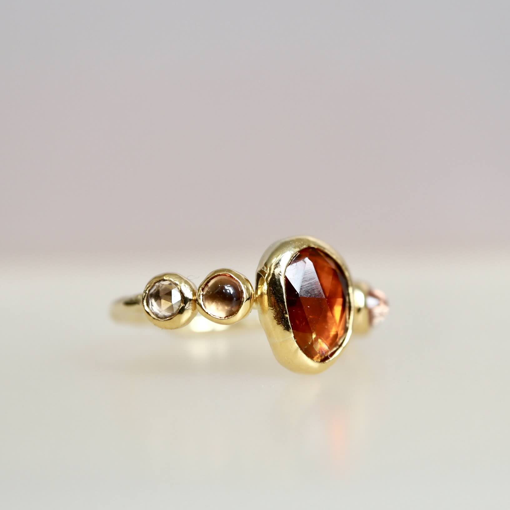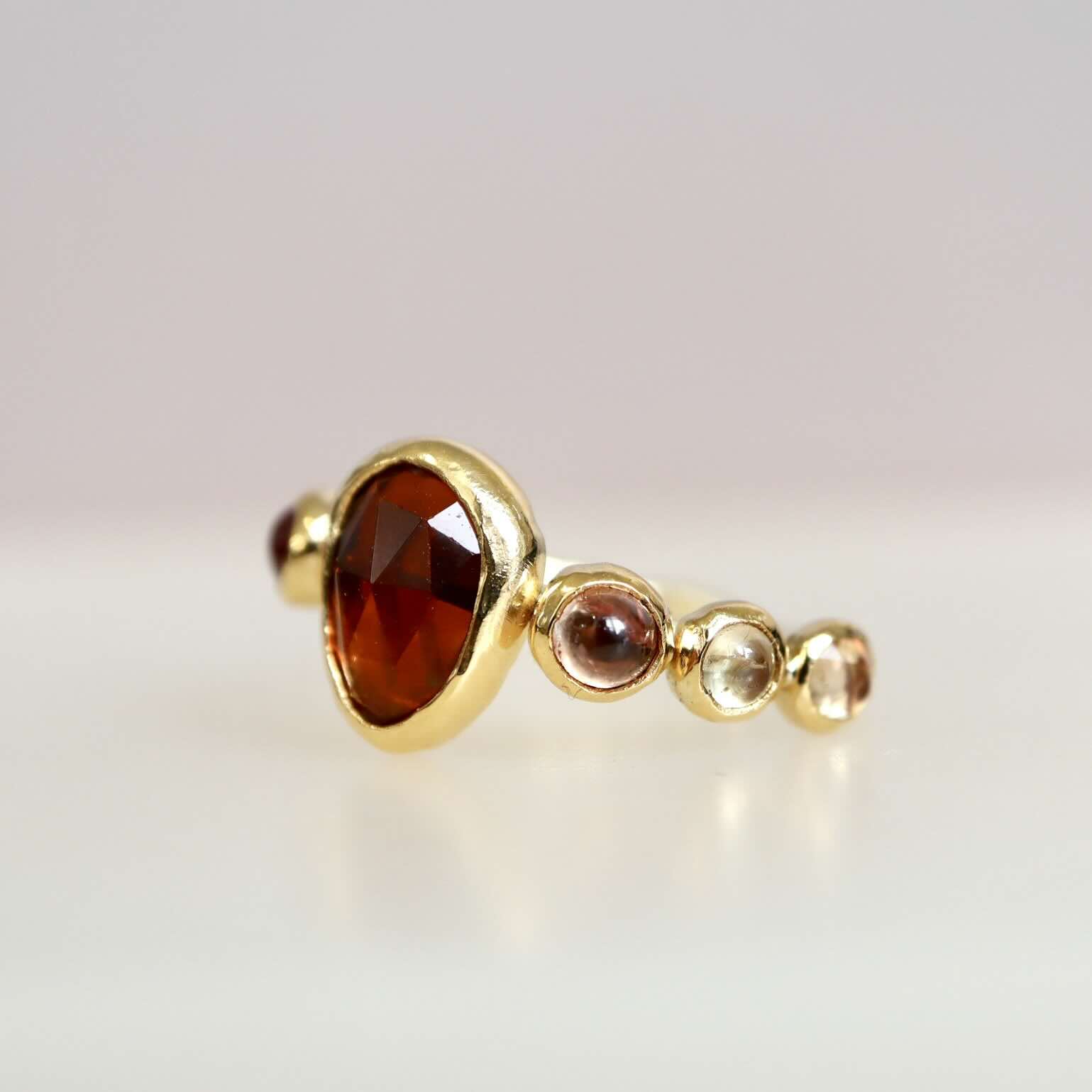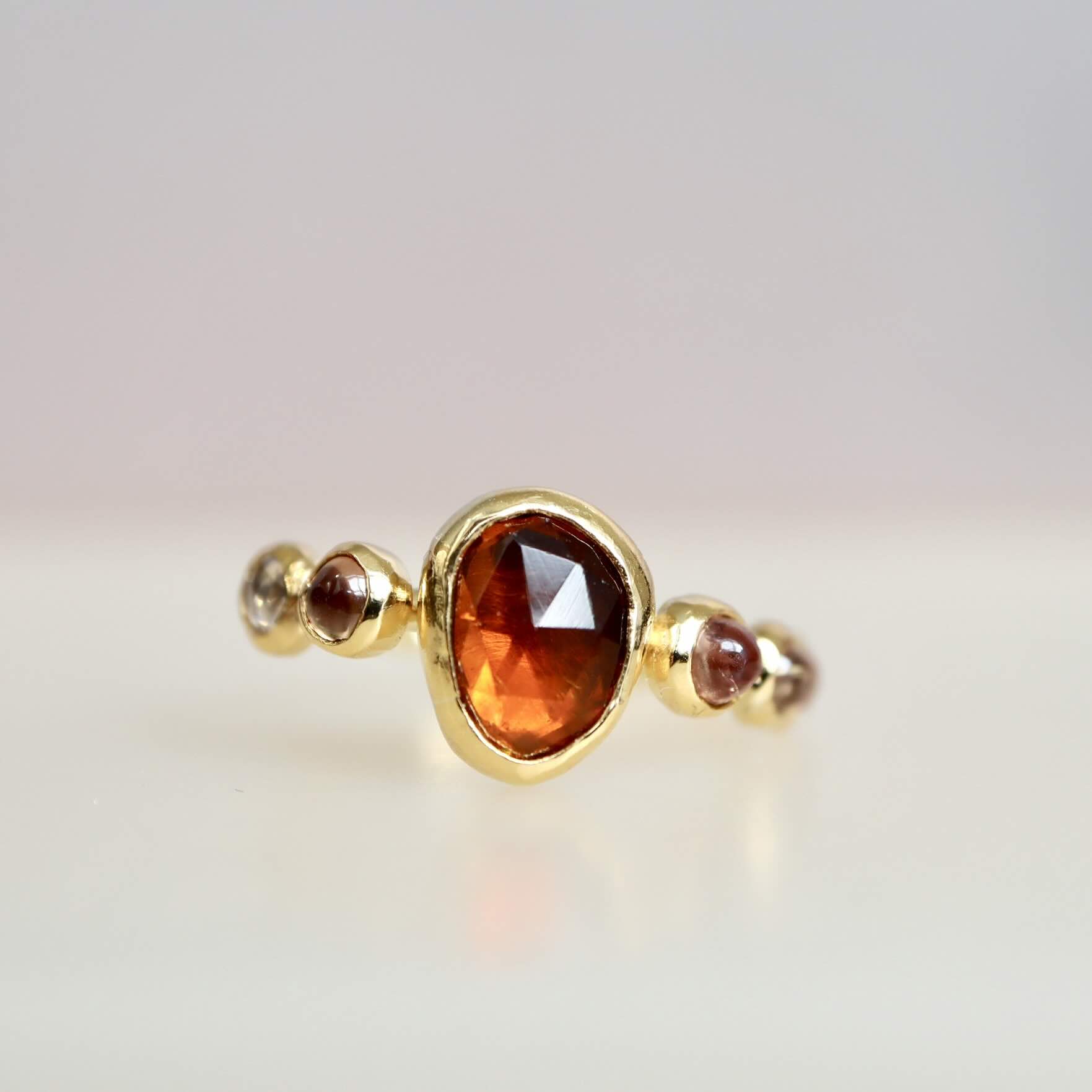 Een rosecut oranje toermalijn, heel warm van tint. Met saffieren in oranje en gele tinten ernaast. Een prachtige volle ring, vol edelstenen. De ring is gemaakt met 22 en 18 karaat goud.