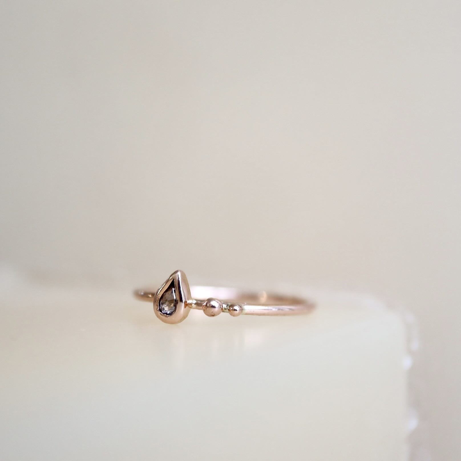 Een lieflijke roodgouden ring met een rosecut druppel diamantje met twee kleine bolletjes goud ernaast. De diamant is 0.06 ct. De ring is gemaakt van 14 karaat goud.
