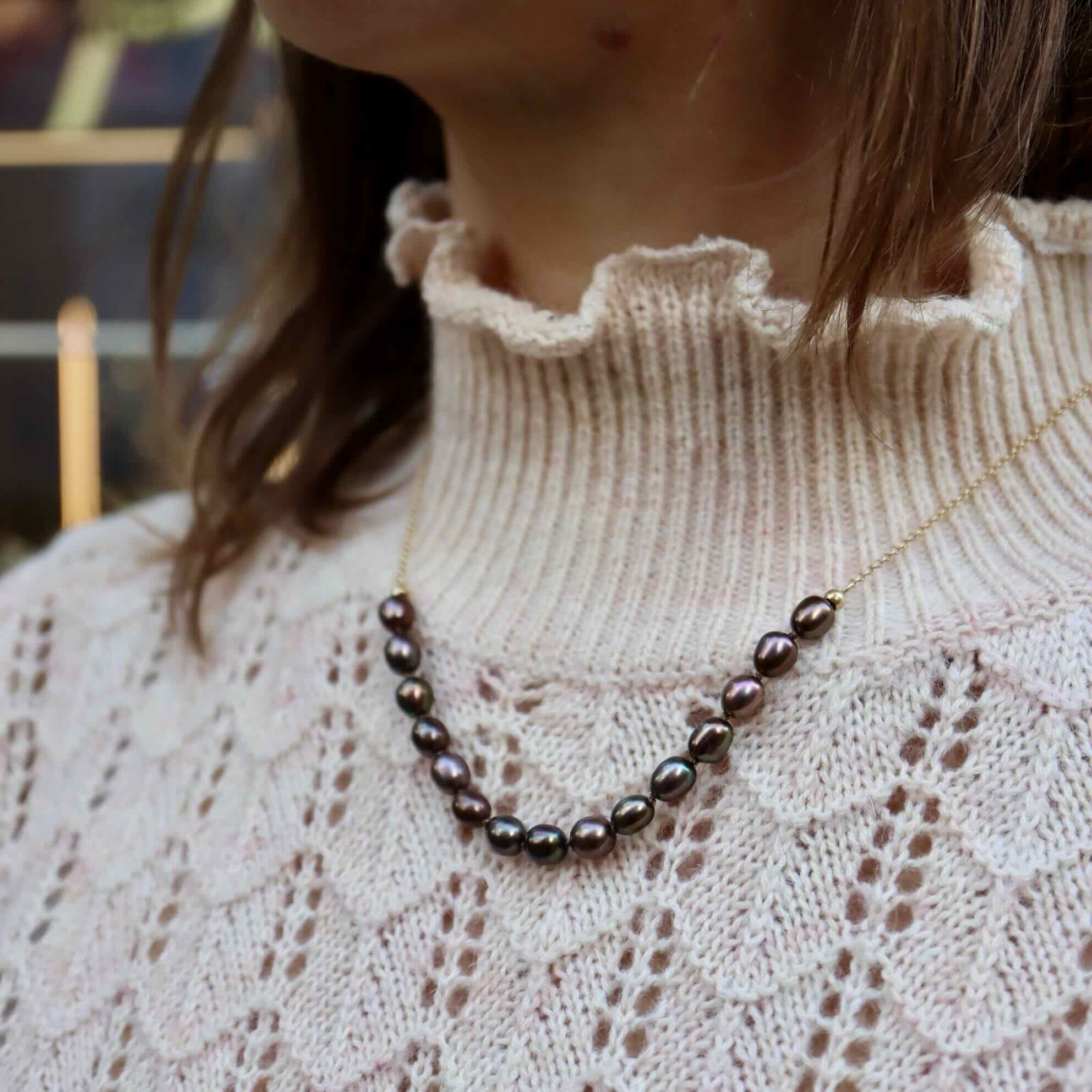 Een jasseron collier met hele mooie zoetwaterparels in warme tinten bruin, groenig, aubergine. De parels glanzen al deze kleuren. Het collier is gemaakt van 18 karaat goud.
