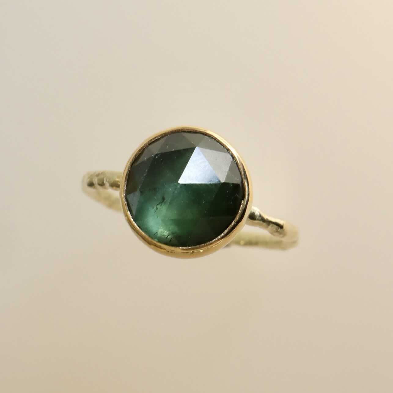 Fonkelend en smeulend donkergroen, een fantastische toermalijn! Gezet in 22 karaat goud. Op een ‘gesmolten’ ring van 18 karaat goud. De rosecut toermalijn is 4.27 ct.