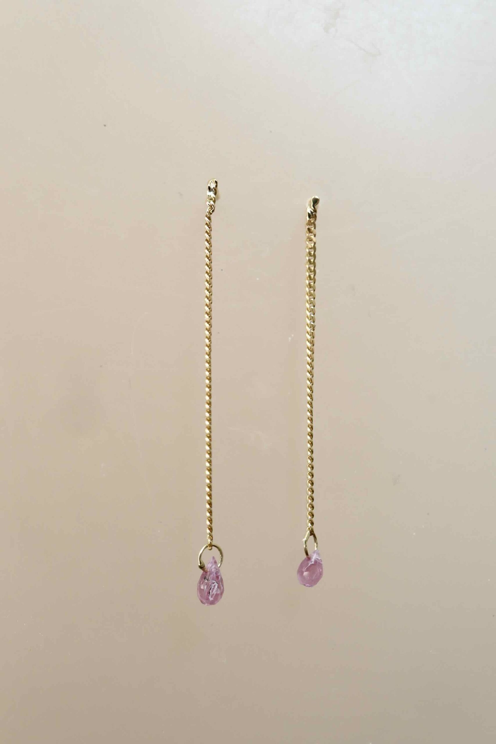 Een sprankelend mooi roze druppel saffiertje onderaan een sliertje gourmette schakels. Super sweet! Deze set oorbellen is gemaakt van 18 karaat goud.