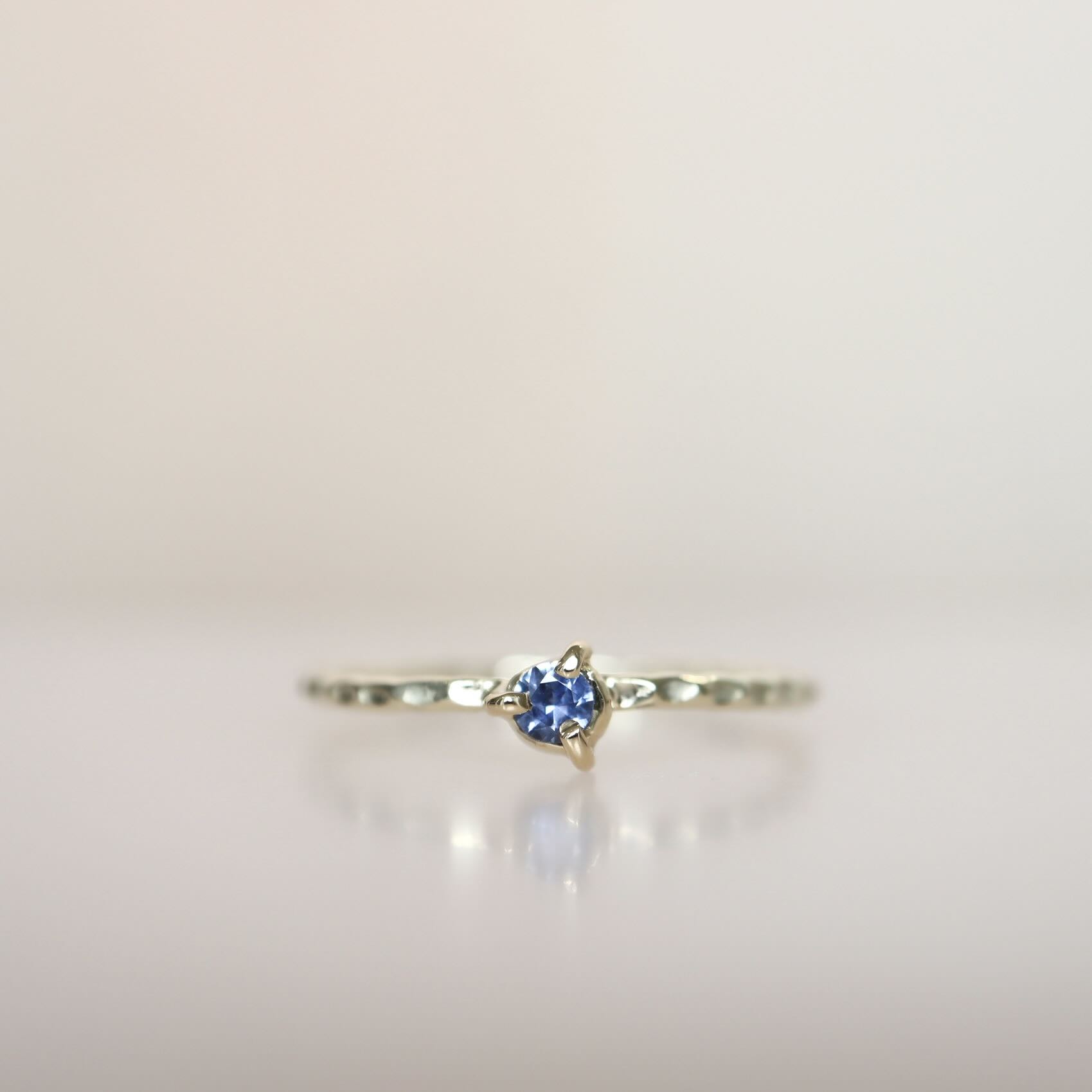 Oe zo’n mooie saffier! Felblauw schitterend. De briljant geslepen saffier van 0.08 ct. is tussen de ring gezet in een zetting met drie pootjes, gemaakt van 22 karaat goud. De ring is gemaakt van 14 karaat goud en heeft een hamerslag structuur.