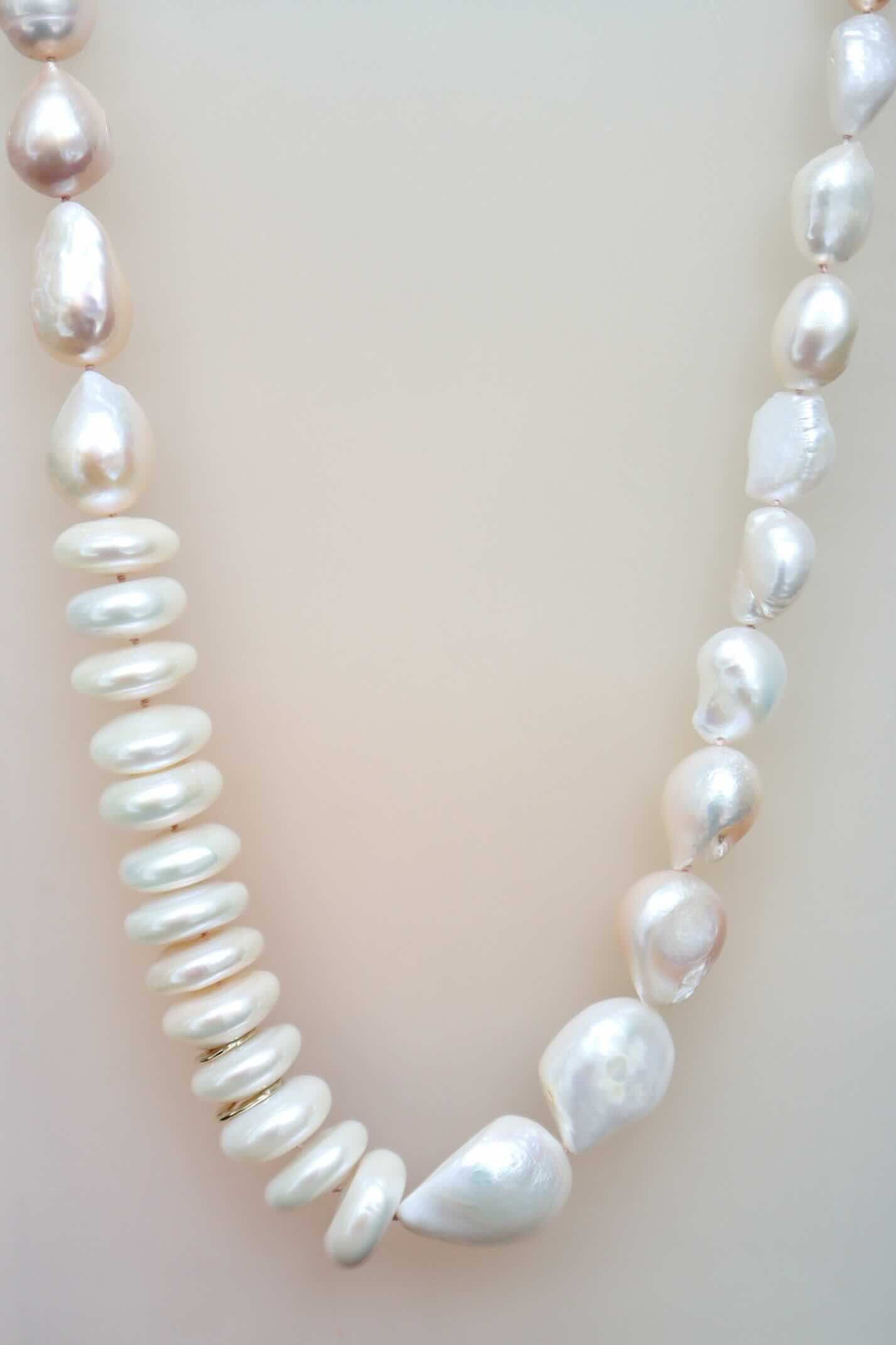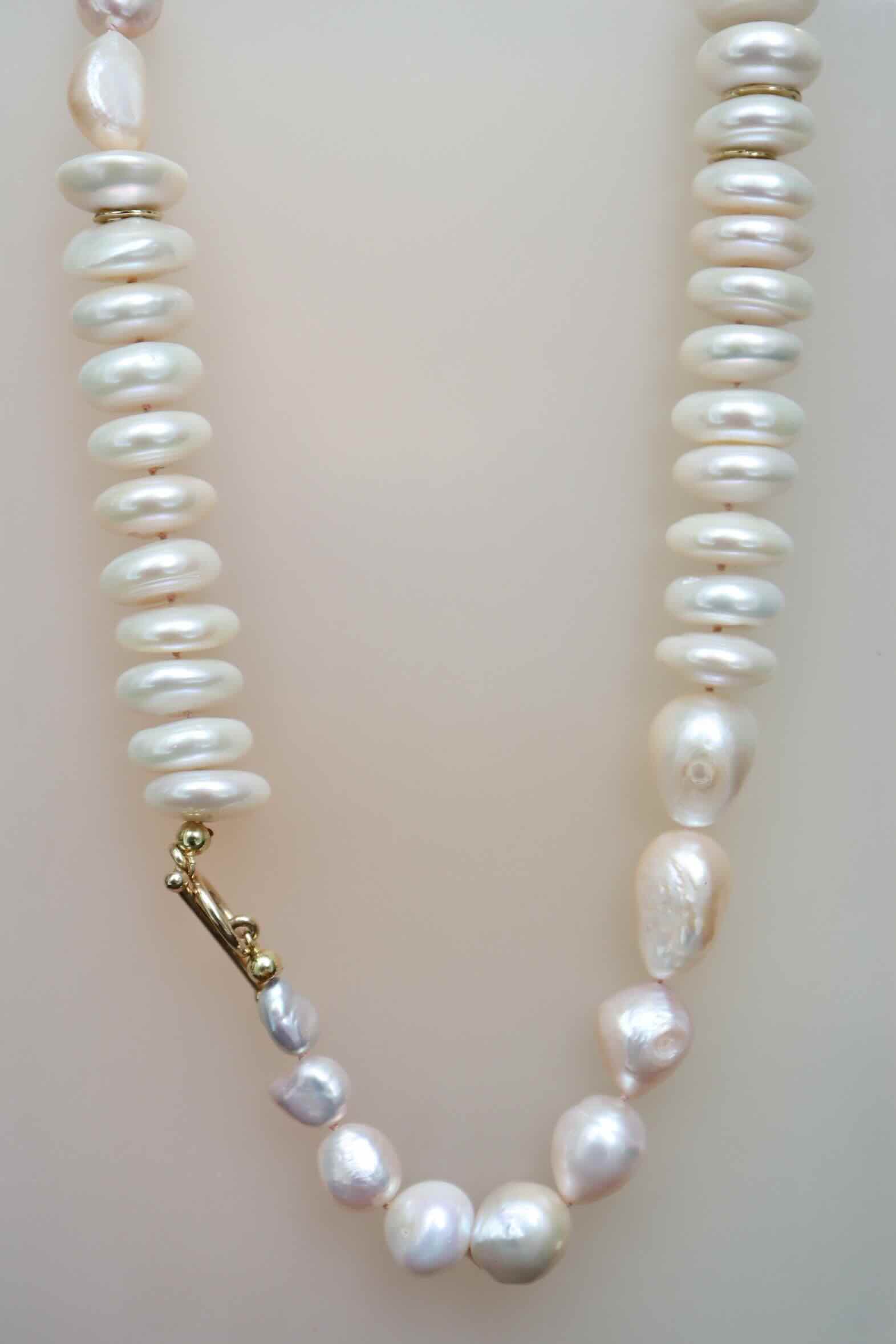 Parel dices en weelderige druppel vormen in crême wit en zachtroze. Met een groot, handgemaakt kapitel slot van 14 karaat goud en drie gouden accent ringetjes.