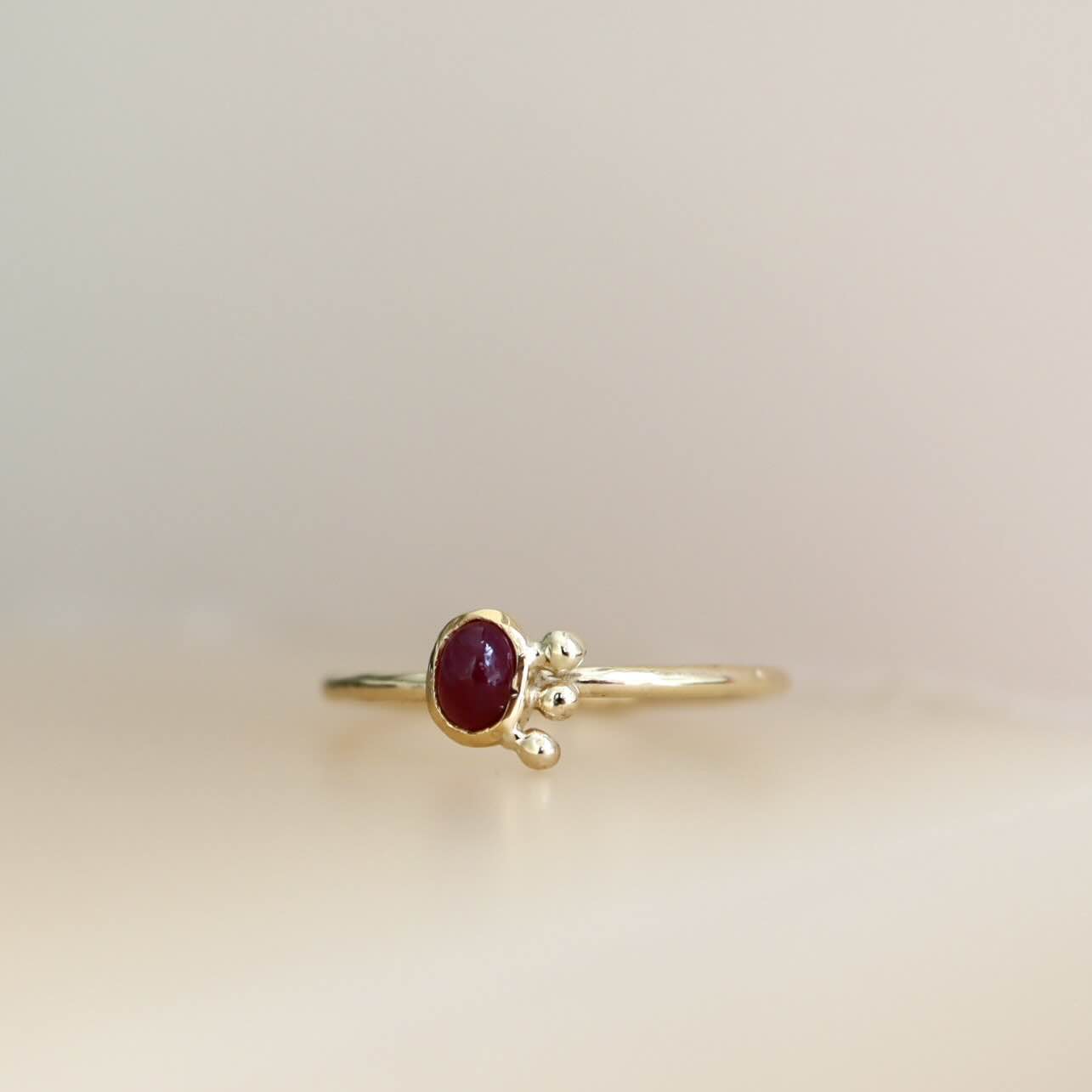 Een heel lichtjes gesmolten ring met een robijn met drie bolletjes goud ernaast. Héél lief! De robijn is 0.315 ct. De ring is gemaakt van 22 en 14 karaat goud.