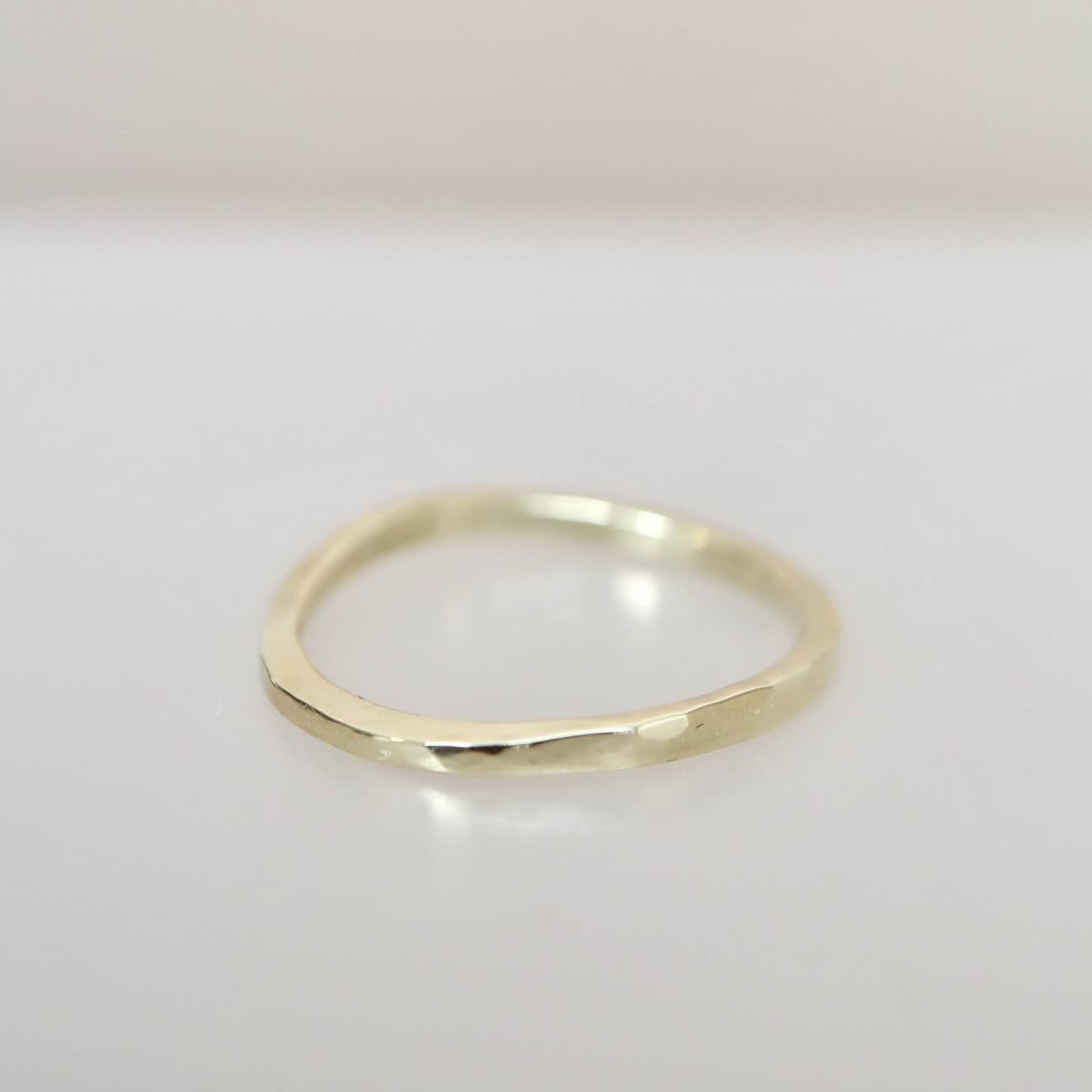 Een golvende ring met een hamerslag. Subtiel met een groots effect. Gemaakt van 14 karaat goud.