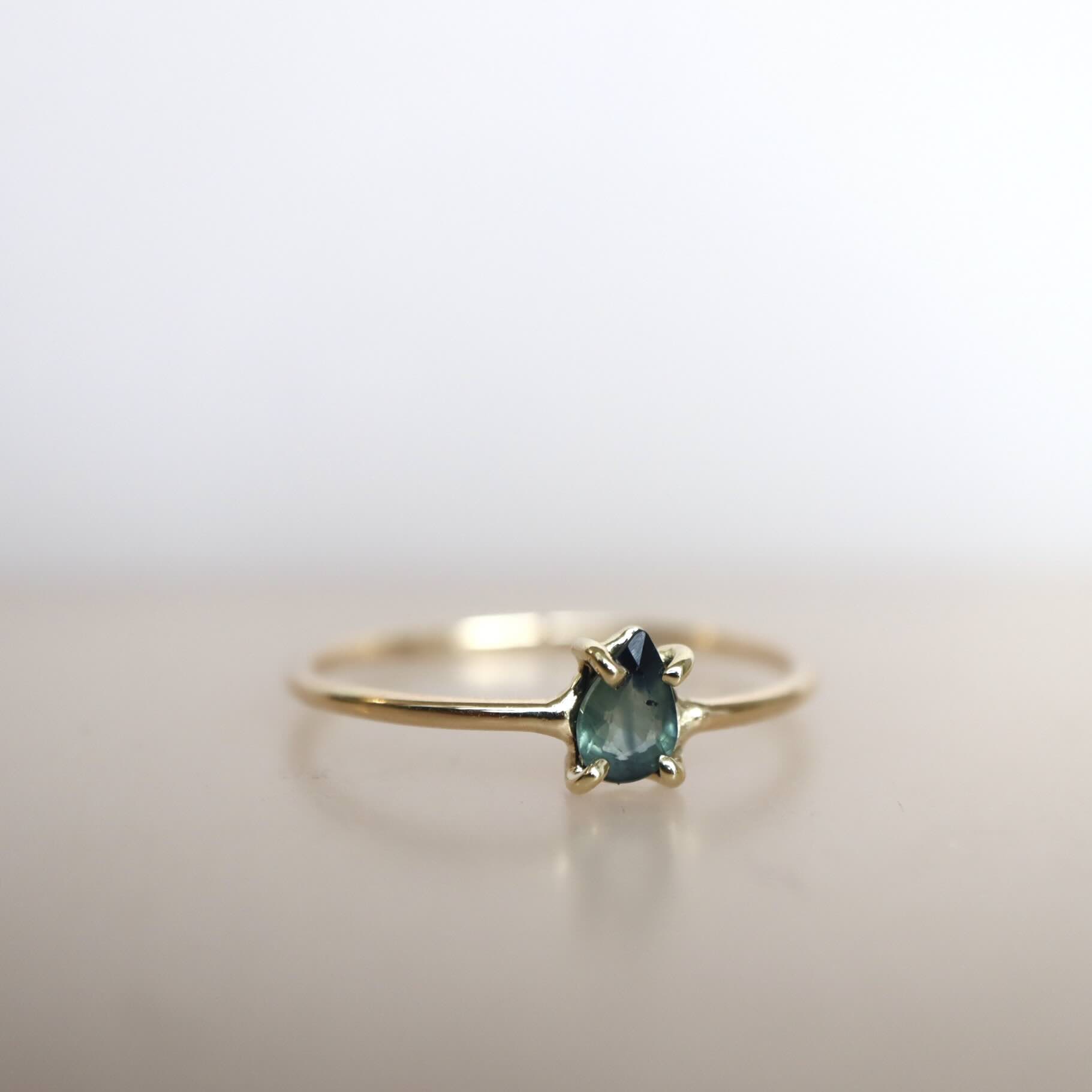 Een flonkerende grijzig blauwe saffier in een druppelvorm tussen de ring. De vier pootjes houden de saffier luchtig vast. De ring is gemaakt van 14 karaat goud. De saffier is 0.38 ct.